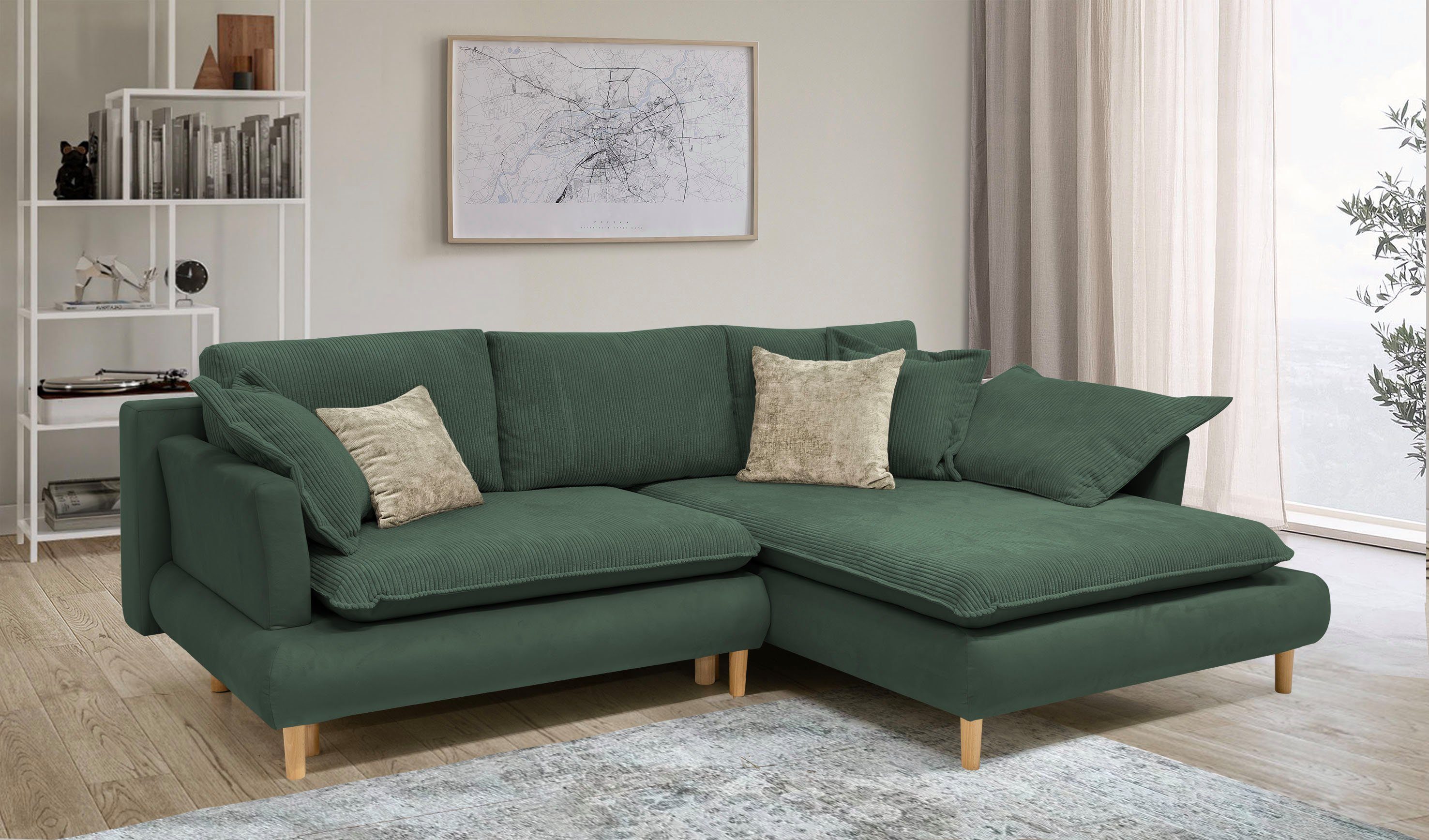 Eine dauerhaft elastische und komfortable Sitzfläche — das bekommst du bei diesem Ecksofa »Mandela L-Form« von COLLECTION AB, das mit einer hochwertigen Wellenunterfederung ausgestattet ist. Zudem handelt es sich hierbei um ein echtes Platzwunder, da es mit einem ausziehbaren Bettkasten versehen und somit Schlaf- und Ruhezone in einem ist. Worüber du dich auch freuen kannst, ist das passende Rückenkissen, die nicht nur schöne Deko-Element sind, sondern auch für noch mehr Komfort sorgen. Von vorne betrachtet ist die Recamiere nach rechts ausgerichtet. Der Bezug aus Samtvelours sieht trendig aus und besticht durch seine angenehme Weichheit. Dieses Modell wurde von Hand gefertigt.