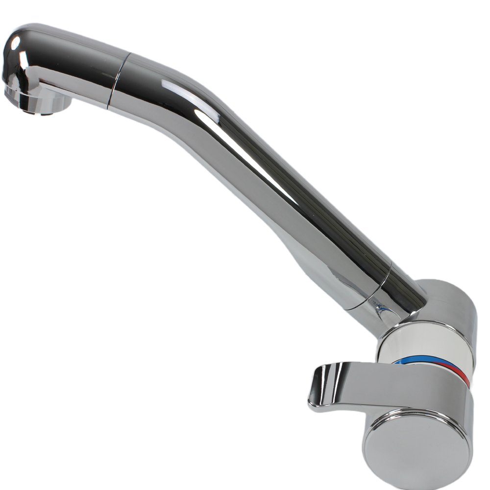 Hinweis: Durch drehen des Mischer Griffes wird der Schalter für die Pumpe aktiviert. Drehen sie den Mischer weiter nach oben oder unten können sie die gewünschte Temperatur ganz einfach einstellen. Der Auslaufhahn ist im eingebauten Zustand um fast 320° klappbar und lässt sich somit platzsparend hoch oder runter klappen.