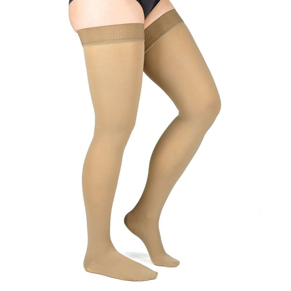 Die Compressana Leganza Kompressionsstrümpfe sind besonders elegant und haben einen hohen Tragekomfort. Das Maschenbild ist gleichförmig und fein, sodass sich die Schenkelstrümpfe sehr weich auf der Haut anfühlen und eine glatte Oberfläche haben.
