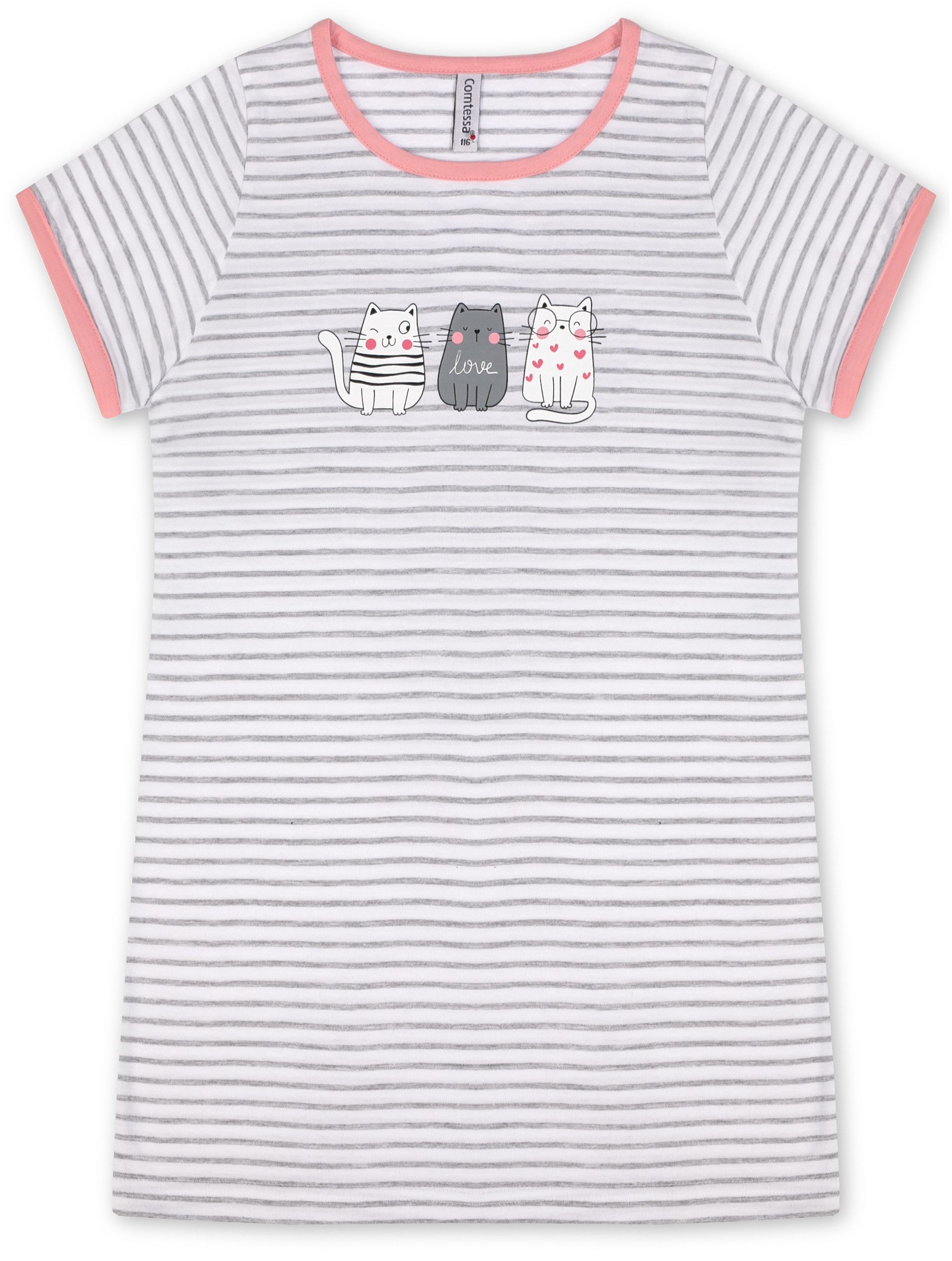 Das Nachthemd ist mit kurzen Ärmeln und einem bequemen Rundhalsausschnitt versehen, der für eine angenehme Passform sorgt und genügend Bewegungsfreiheit bietet. Ein besonderes Highlight ist der lustige Kätzchen-Druck auf der Brust, der dem Nachthemd eine verspielte und fröhliche Note verleiht. Dieser niedliche Druck wird Ihre Tochter garantiert zum Schmunzeln bringen und ihre Fantasie anregen.