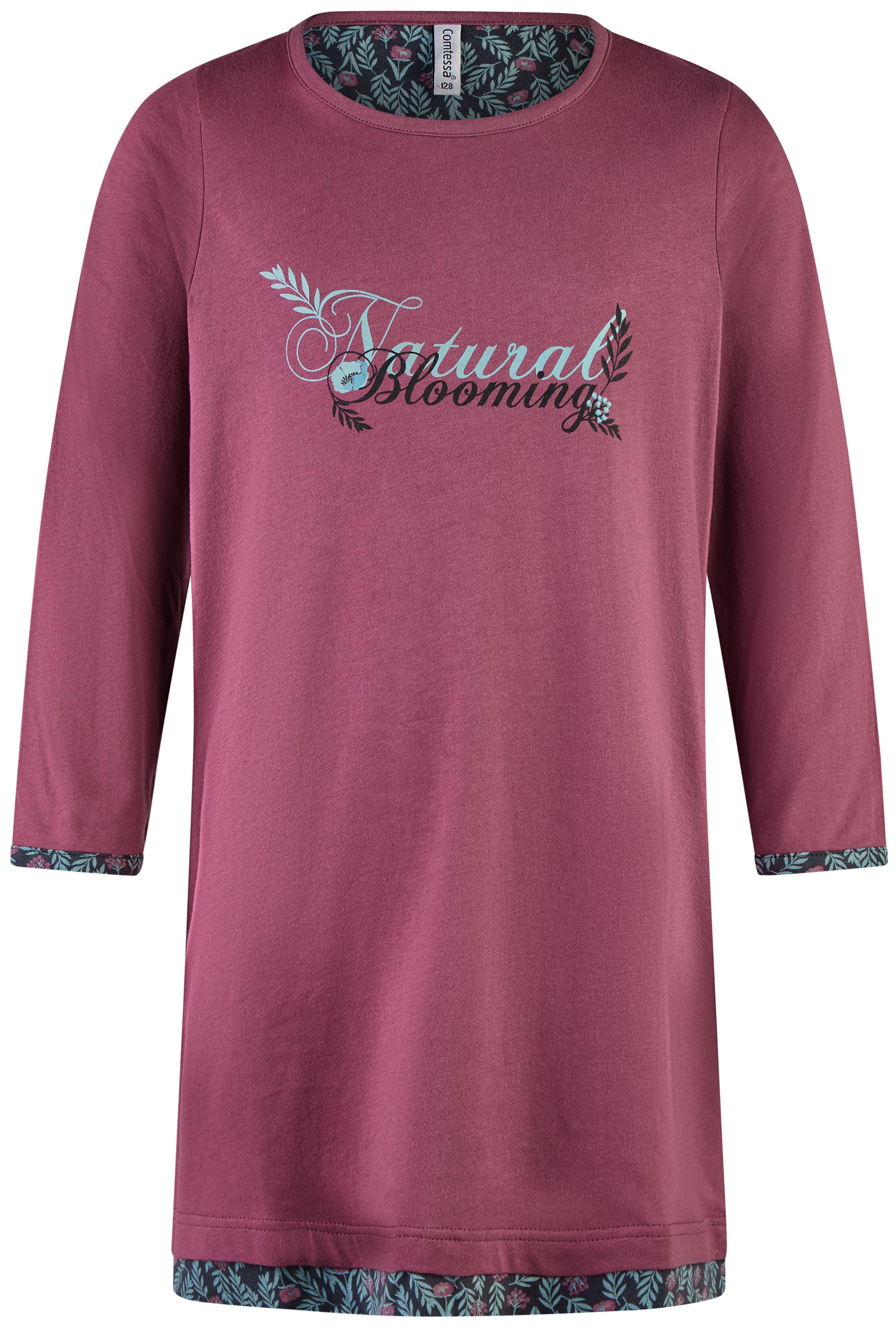 Auf der Brust ziert die zarte Aufschrift „Natural Blooming“ das Nachthemd – eine filigrane, handschriftlich anmutende Schrift, die dem Stück eine persönliche Note verleiht. Umrahmt wird diese Inschrift von feinen, herbstlichen Blumen, die sich wie ein zarter Rahmen um die Schrift legen. Dieser Blumendruck setzt sich als dekoratives Element fort und findet sich als harmonischer Abschluss an den Ärmelbündchen, am Saum sowie im Nackenspiegel wieder.