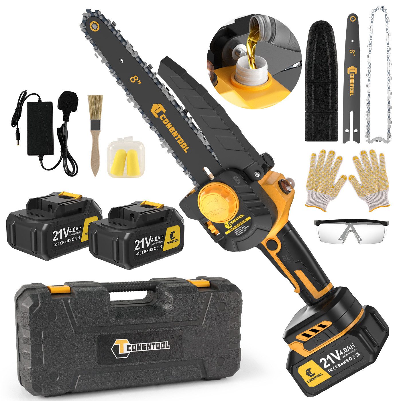 Lieferumfang | 1×21V Mini Kettensäge 2×4,0Ah Akku 1×Ladegerät 2×8 Zoll Führungsplatte + passende Kette Reinigungsbürste, Ölflasche, Ohrstöpsel, Handschuhe, Schutzbrille |