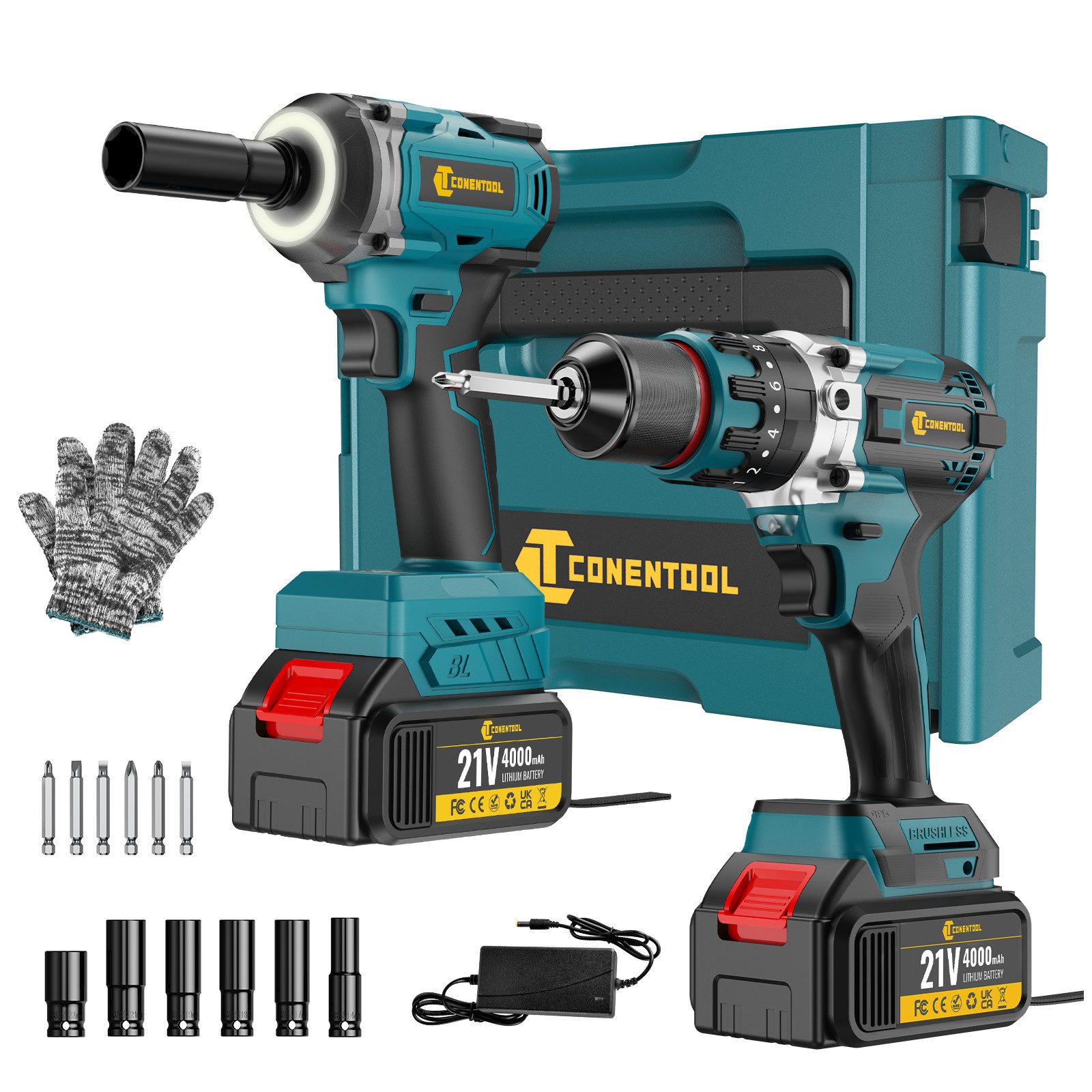 Mit dem Conentool 2-in-1 Akku-Werkzeugset erhalten Sie zwei leistungsstarke Geräte in einem Set: Ein Akku-Schlagschrauber mit bis zu 520 Nm Drehmoment, ideal zum Lösen und Anziehen von Radmuttern, und ein 3-in-1 Bohrschrauber mit Schlagfunktion, der auch härtere Materialien wie Ziegel oder Mauerwerk bewältigt.