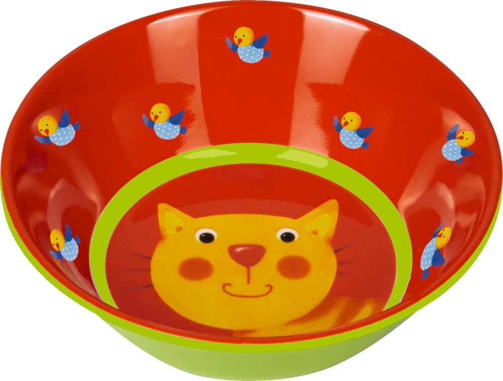 Freche Rasselbande Schale Katze: Kindgerechtes Design in grün und rot. Die Schale hat einen Durchmesser von ca. 13,5cm groß und 4cm hoch.