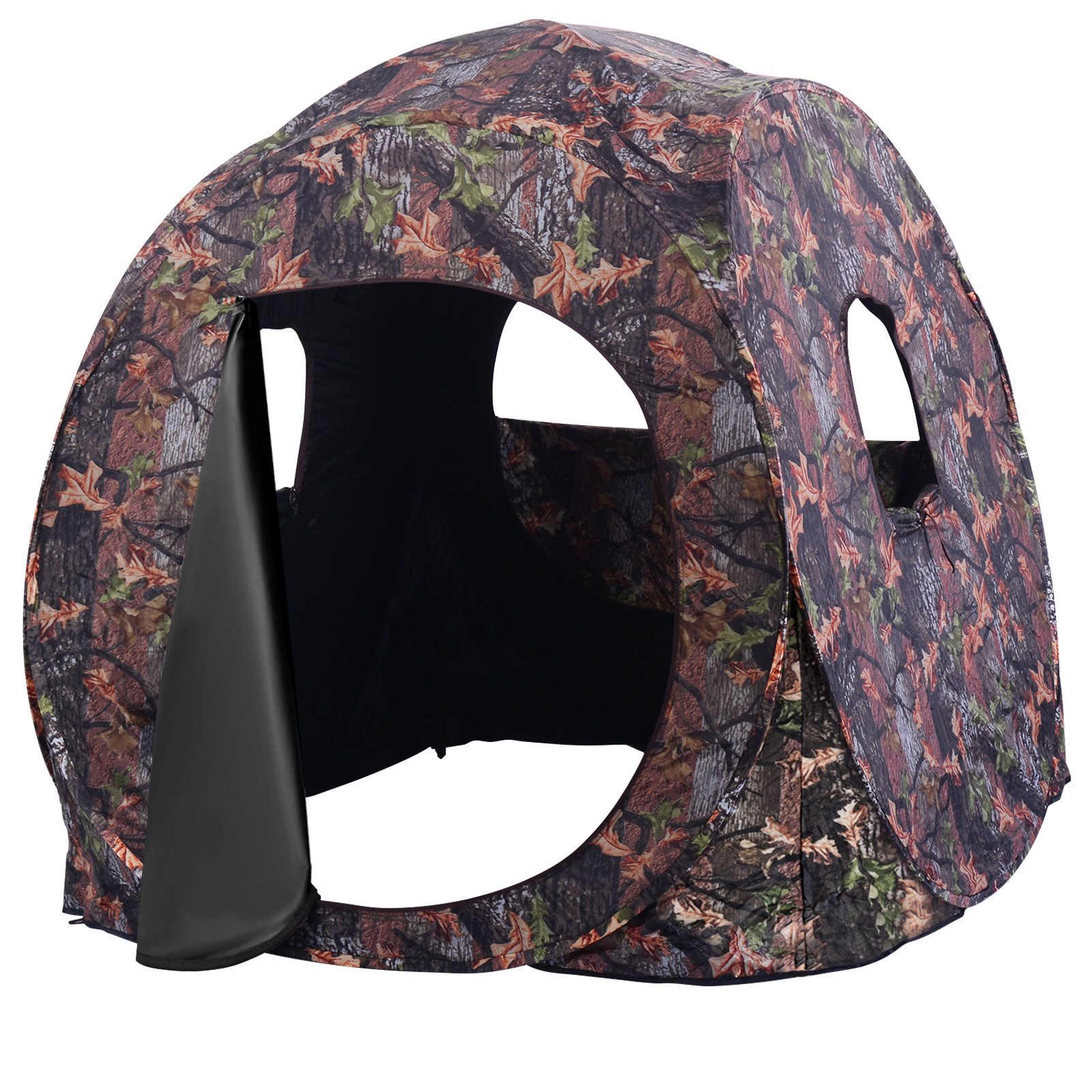 Dank des Pop-up-Designs ist das Jagdversteck einfach zu installieren und drei Personen können darin gemeinsam die Jagd genießen. Das Jagdzelt verfügt über einen Stahlrahmen und weist eine gute Stabilität auf. Zusammen mit Erdspießen und Spanngurten ist für eine perfekte Stabilität gesorgt. Darüber hinaus ist es vollständig mit Kunstleder-beschichtetem Oxford-Gewebe überzogen, sodass das Versteck wasserfest ist, um Regentagen standzuhalten, und langlebig für eine längere Lebensdauer. Zusätzlich ist der Unterstand neben einer Tür mit Reißverschluss auch mit zwei kleinen Seitenfenstern und einem großen Mittelfenster ausgestattet, um eine Sicht von etwa 270° zu ermöglichen. Jedes kleine Fenster ist zur besseren Tarnung mit einem durchsichtigen Hakennetz ausgestattet.