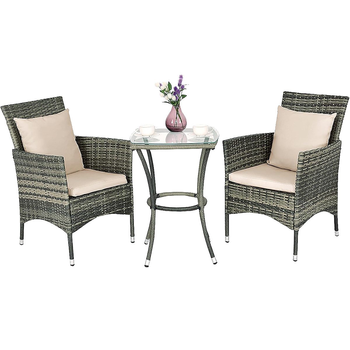 Das Gartenmöbel Set enthält einen Tisch und zwei Stühle. Die Stühle sind bequem, noch dazu mit den mitgelieferten Kissen. Die größe der Tischplatte ist ausreichend für zwei Personen. Und mit der Glasplatte ist das Gartenmöbel leicht zu reinigen. Das Rattanmöbel ist ein Highlight in Ihrem Innenraum. Dieses Balkonmöbel Set aus Rattan ist auch perfekt für Ihren Außenbereich. Moderne Gartenmöbel wie diese machen Balkon und Garten zu einem Wohlfühlort.