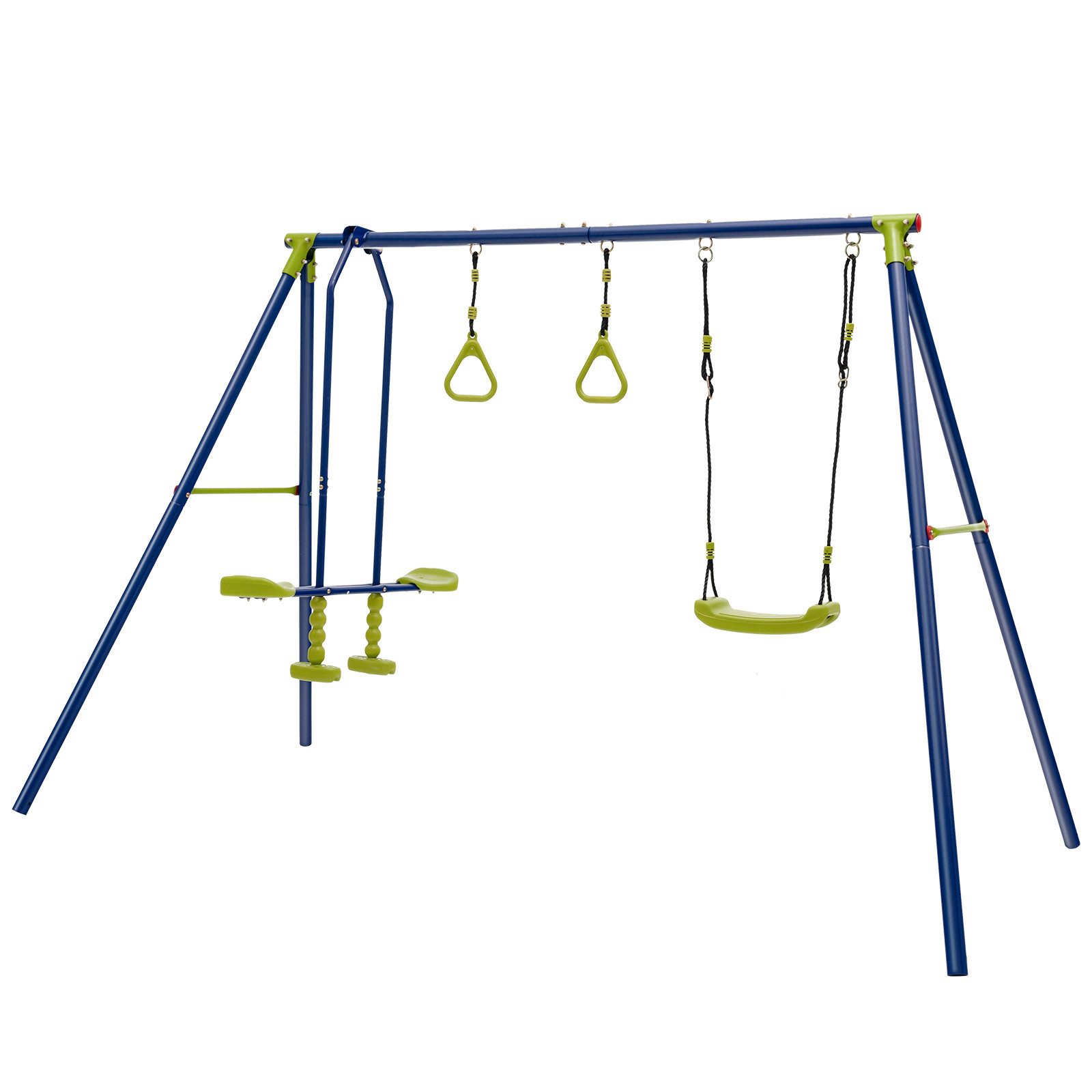 Unser Schaukelset hinterlässt bei Ihren Kindern wertvolle und süße Kindheitserinnerungen! Dieses multifunktionale Schaukelset ist mit attraktiven Spielbereichen ausgestattet, darunter 1 Schaukel, 1 Wippe und 2 Turnringe, die Ihren Kindern das ganze Jahr über unendlich viel Spaß bereiten. Darüber hinaus können Sie die Höhe des Schaukelsitzes zwischen 88 cm und 128 cm einstellen, um unterschiedliche Bedürfnisse zu erfüllen. Sein U-förmiger Sitz und seine Fußstütze lassen Ihre Kinder glücklich schaukeln und spielen. Währenddessen verleihen zusätzliche Erdspieße dem Schaukelständer mehr Stabilität. Es ist eine großartige Möglichkeit für Kinder, große Freude mit Freunden zu teilen. Diese tolle Schaukel kann im Hinterhof, im Garten, im Park und auf dem Spielplatz usw. verwendet werden.