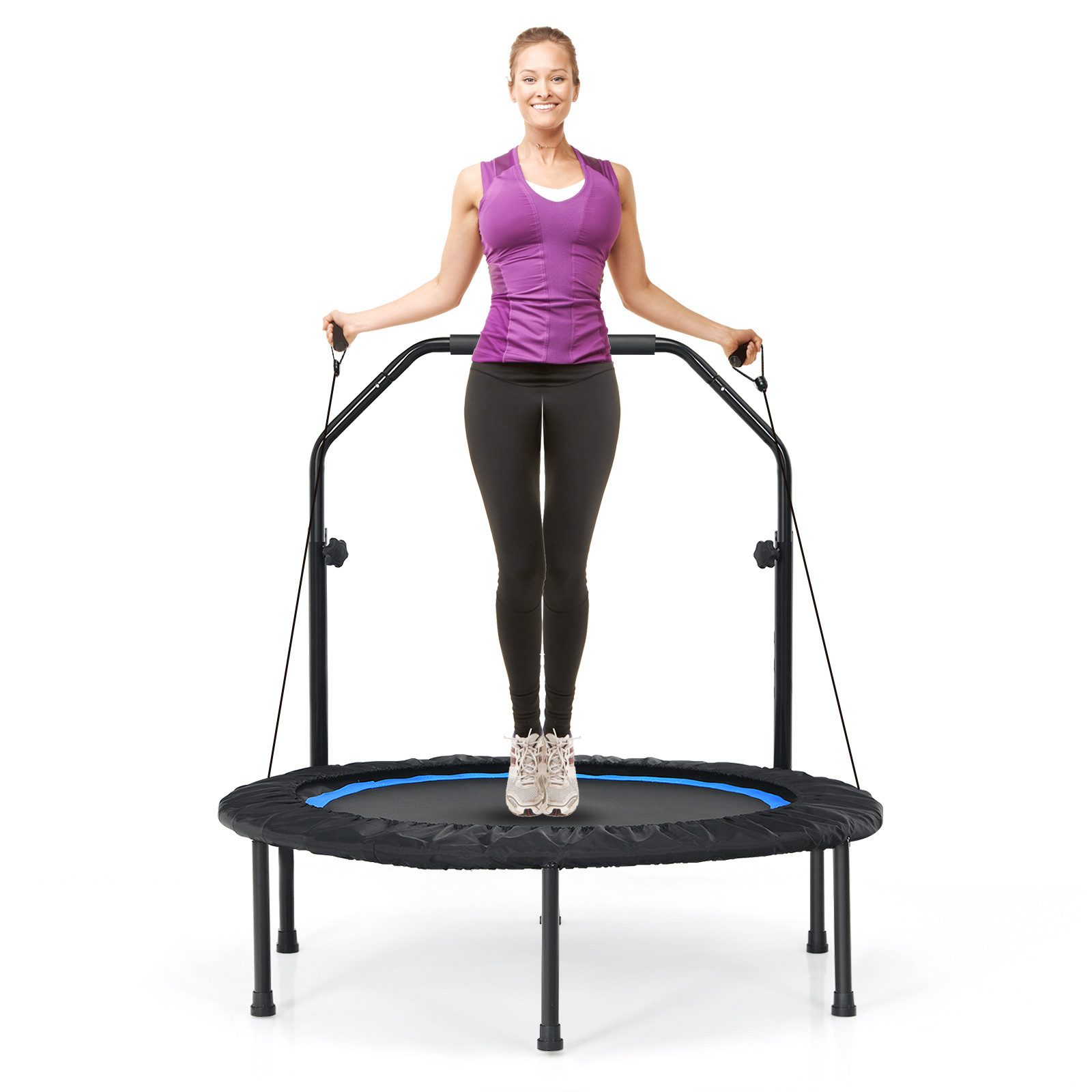 Durch den 4-fach verstellbaren Griff eignet es sich sowohl für Kinder als auch für Erwachsene. So können viele verschiedene Übungen durchgeführt werden, seien es Sprünge, Stretching, Yoga, Sit-ups, Squads, etc. Außerdem werden 2 Widerstandsbänder mitgeliefert. Sicherheit steht an erster Stelle. Durch die robuste Stahlkonstruktion und die langlebige PP-Sprungmatte ist eine Tragkraft von 150 kg gegeben. Außerdem sorgen 6 rutschfeste Untersetzer für einen stabilen Stand. Sie und Ihre Familie werden mit diesem Trampolin viel Spaß haben.
