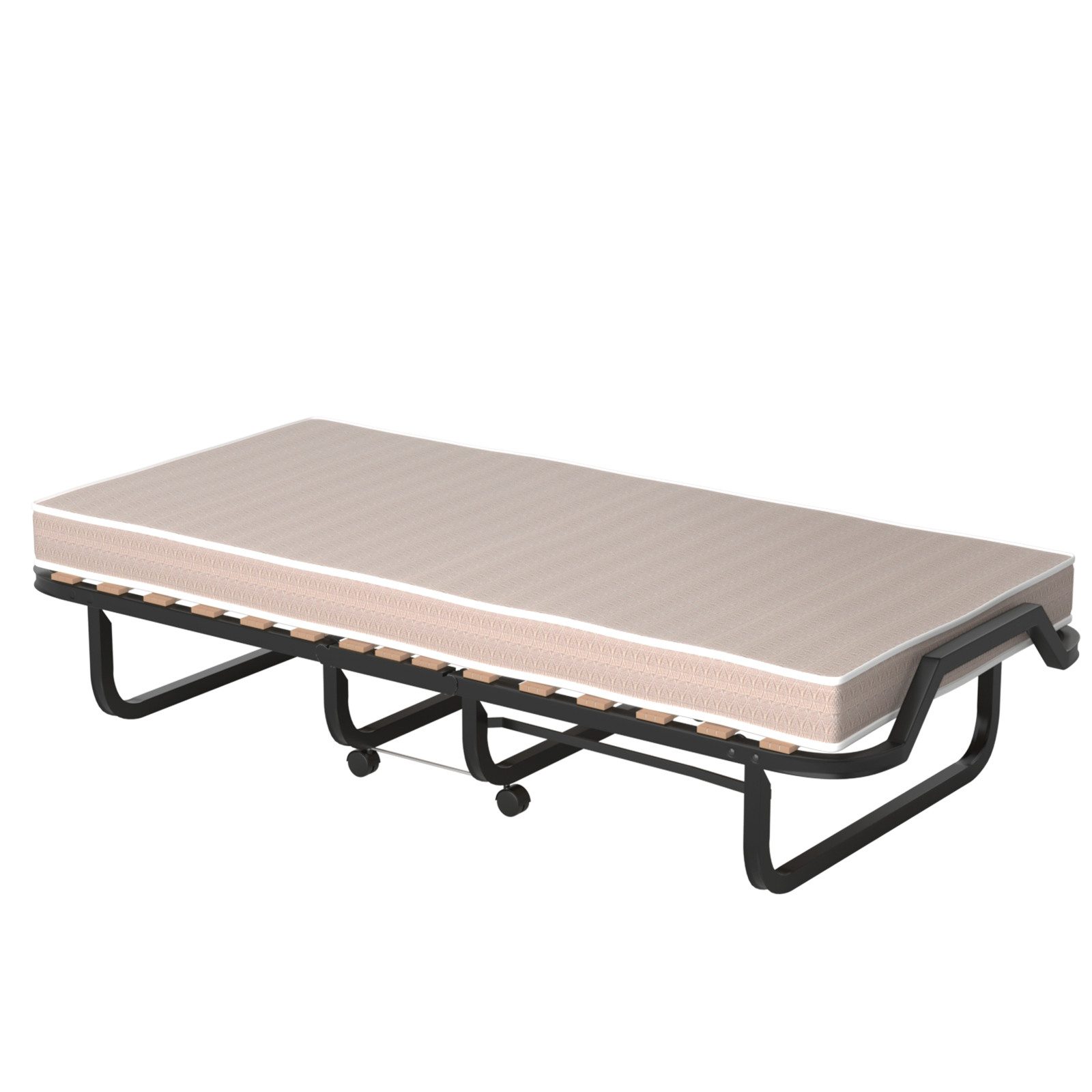 Haben Sie immer noch Probleme, kein zusätzliches Ersatzbett für Gäste zu haben oder sich im Büro nicht ausruhen zu können? Unser aus Italien hergestelltes Klappbett mit Matratze wird Ihre ideale Wahl sein! Der aus hochwertigem Stahl gefertigte Bettrahmen ist robust und langlebig mit einer langen Lebensdauer. Robuste Holzlatten und hochbelastbare Beine sorgen für eine hervorragende Tragfähigkeit. Die Matratze besteht aus hochdichtem Stützschaum und Memory-Schaum, der weich und elastisch ist. Dieses Bett ist außerdem mit 4 leichtgängigen Rädern ausgestattet, die Sie überall hin bewegen können. Darüber hinaus kann dieses Bett bei Nichtgebrauch zur Aufbewahrung schnell auf eine kompakte Розмір zusammengeklappt werden.