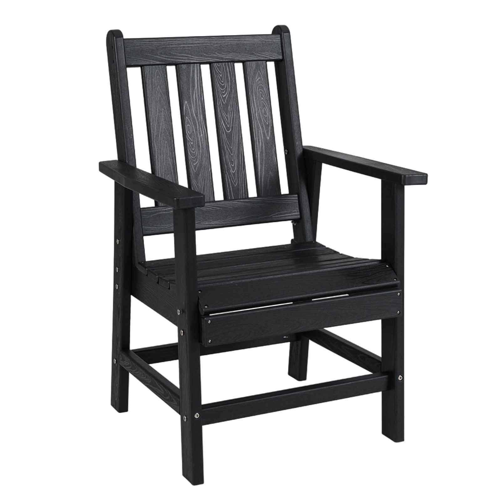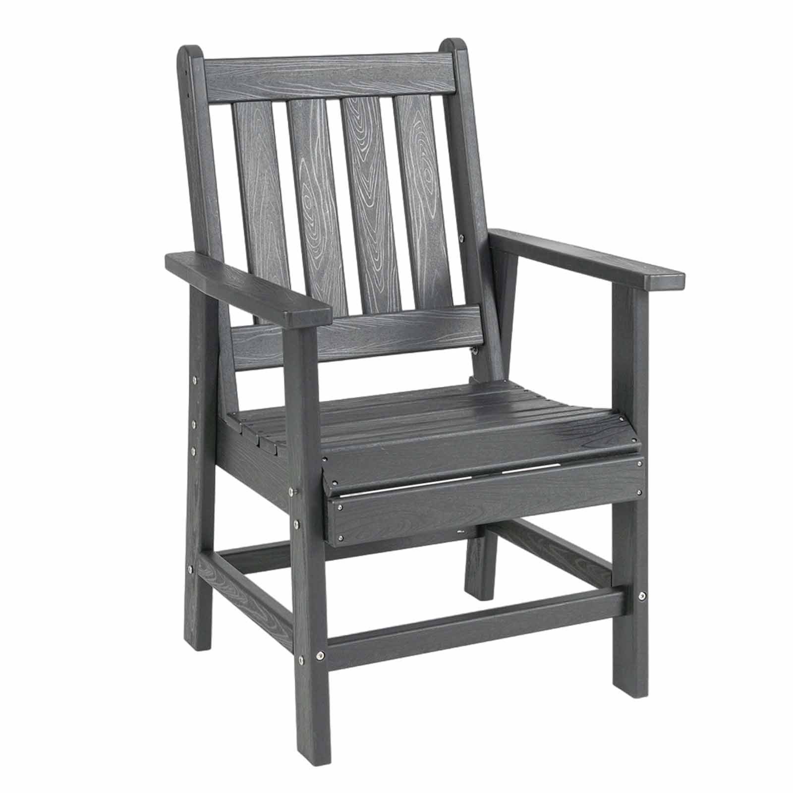 Gefertigt aus hochwertigem HDPE ist der Terrassen-Esszimmerstuhl wasserdicht und farbbeständig. Die geneigte hohe Rückenlehne bietet optimale Entspannung für Ihren Rücken und Ihre Taille. Darüber hinaus bieten der ergonomisch geformte Sitz und die breiten Armlehnen hervorragenden Halt und Komfort für Ihren Körper. Der stabile A-förmige Rahmen mit verstärkten Querstangen sorgt für hervorragende Stabilität. Mit Edelstahlbeschlägen gebaut, kann sich der Armstuhl an Außenelemente anpassen. Darüber hinaus ermöglicht das Lamellensitzdesign den Luftstrom und verhindert Wasseransammlungen. Mit Holzähnlicher Textur kann der Outdoor-Seitenstuhl nahtlos Ihren Garten, Hinterhof oder Ihre Terrasse ergänzen.