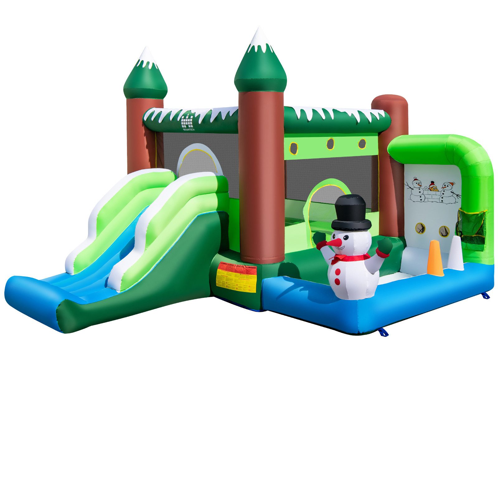 Die Hüpfburg ist im Winterthema gestaltet und verfügt über einen liebenswerten Schneemann, der die lieben Kinder anlockt. Sie besteht aus einer leichtgängigen Rutsche, einem großzügigen Sprungbereich sowie einem großen Bällebad. Ihre Kinder können interessante Spiele spielen, zum Beispiel Bälle werfen, Ringe werfen oder Körbe werfen. Zweifellos wird Ihr Kleines jede Menge Spaß haben! Außerdem schützen die Netzwände und die erhöhten Handläufe sie beim Spielen. Darüber hinaus sorgt das reißfeste PVC-beschichtete Oxford-Gewebe für eine lange Lebensdauer. Und das Paket enthält ein komplettes Zubehörset, darunter ein elektrisches Gebläse, eine Tragetasche, ein Reparaturset und 8 Erdspieße.