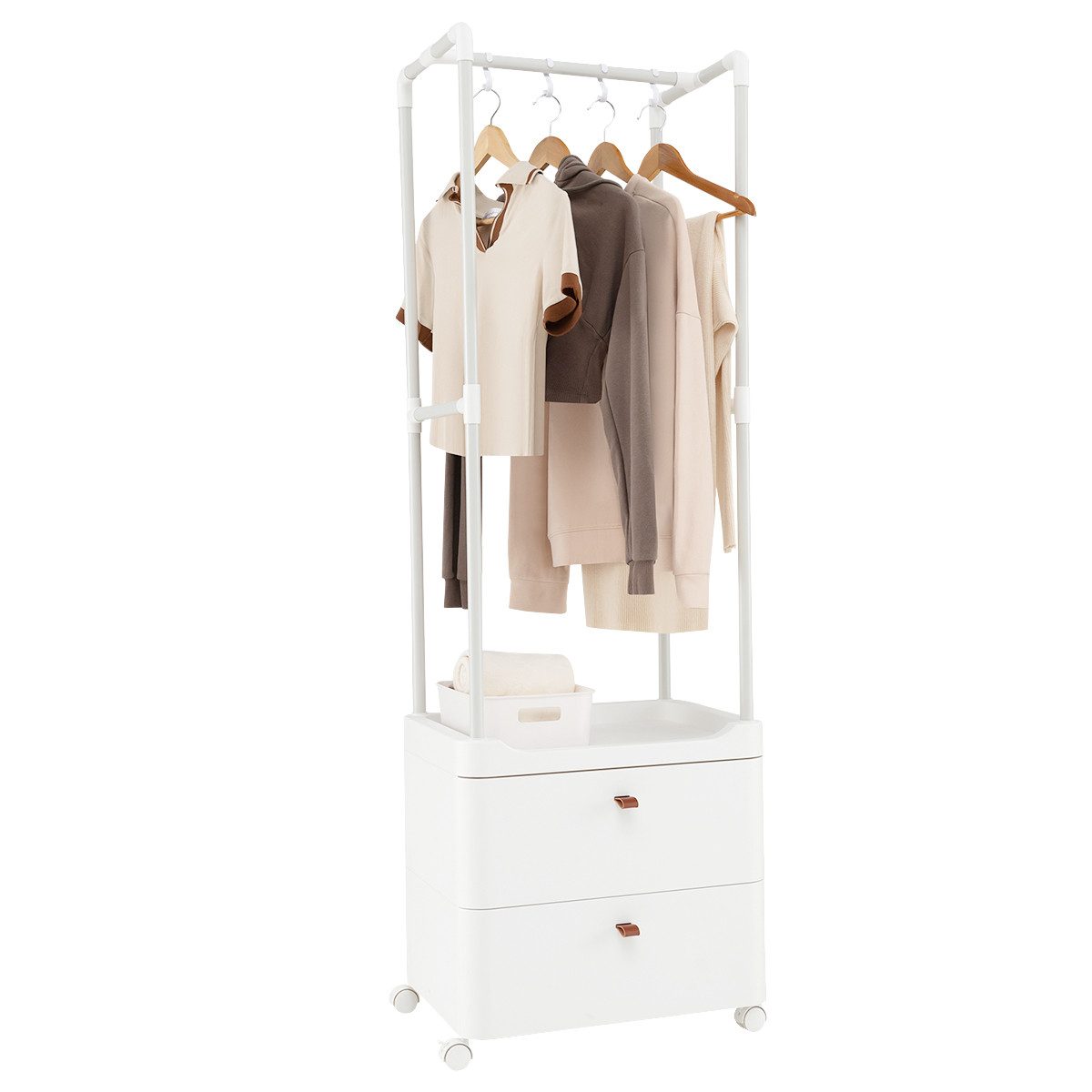 Ordnen Sie Ihre Kleidung mit Stil mit diesem multifunktionalen Kleiderständer mit besserer Verarbeitung. Er verfügt über eine Kleiderstange mit 4 abnehmbaren Haken, eine mittlere Ablage und 2 ausziehbare Schubladen mit 1 Trennwand und bietet einfachen Zugriff auf Ihre Kleidung und Accessoires. Der stabile Metallrahmen mit verstärkten Querstreben sorgt für Stabilität und Sicherheit für alle Ihre Gegenstände. Bewegen und fixieren Sie den Ständer mühelos mit 4 leichtgängigen Universalrädern, von denen 2 für zusätzliche Stabilität feststellbar sind. Werten Sie Ihren Wohnraum mit diesem vielseitigen Kleiderschrank auf, der Lagerregal, Kleiderbügel und Schubladen für eine aufgeräumte und elegante Aufbewahrungslösung kombiniert.