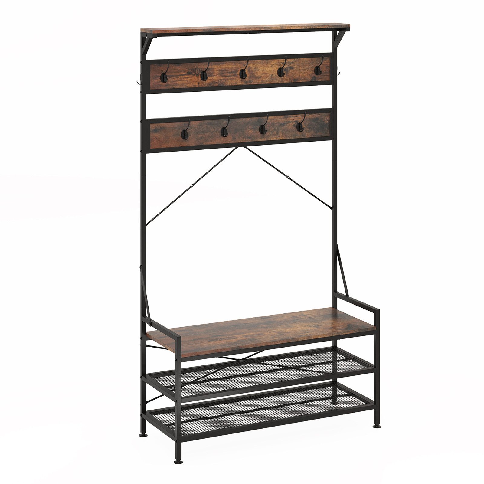 Statten Sie Ihren Wohnbereich mit dem vielseitigen Garderobenständer aus, einer 4-in-1-Aufbewahrungslösung, die ein Ablagefach, eine Garderobe, eine Schuhbank und ein 2-stöckiges Schuhregal umfasst. Sein Design umfasst außerdem 11 Haken zum Aufhängen und bietet reichlich Stauraum für Ihre Alltagsgegenstände. Der robuste Metallrahmen kann bis zu 155 kg tragen und verfügt über verstellbare Fußpolster für Stabilität. Zwei Kippschutzvorrichtungen stellen sicher, dass der Garderobenständer aufrecht steht. Seine stilvolle Beschaffenheit wertet nicht nur Ihre Heimdekoration auf, sondern passt auch nahtlos in Eingangsbereiche, Wohnzimmer oder Schlafzimmer.