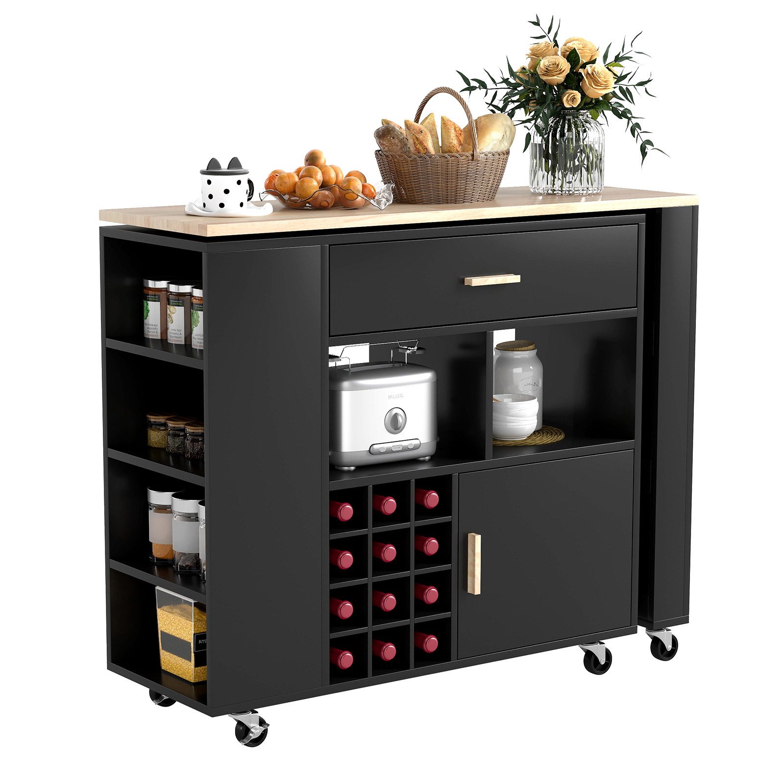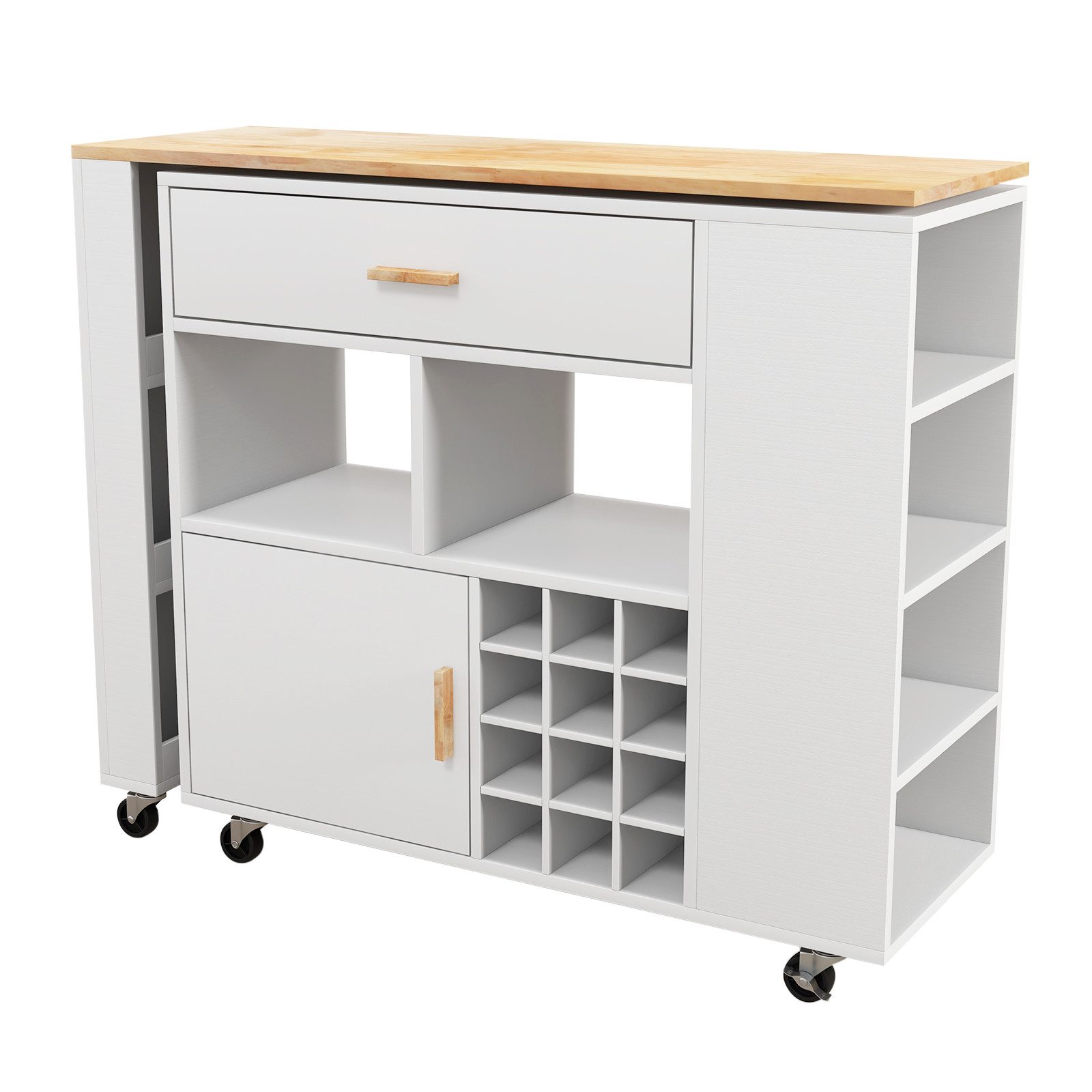 Dieser 2-in-1-Kücheninselwagen ist eine großartige Möglichkeit, Ihr Zuhause zu verwandeln, da er durch Drehen der Tischplatte als Bartisch dienen kann. Wie Sie sehen können, verfügt der mobile Servierwagen über eine breite Arbeitsplatte aus Gummiholz, damit die Küchenutensilien, die Sie benötigen, immer griffbereit sind. Die große Schublade, die 2 offenen Regale, der Aufbewahrungsschrank und die 5-stufigen Seitenregale bieten Platz für eine Vielzahl von Küchenutensilien.