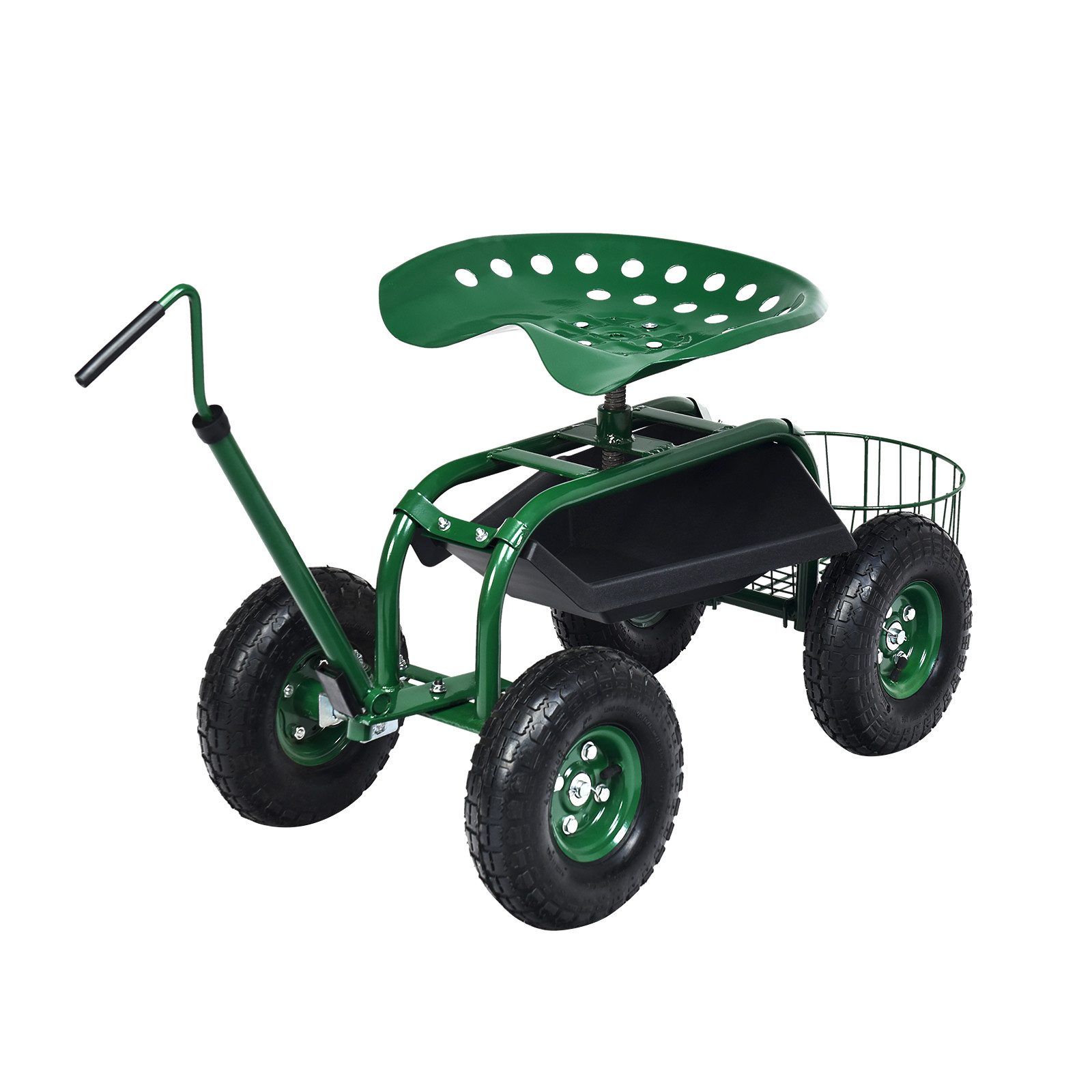 Der vielseitige Gartenwagen ist so konzipiert, dass er lange hält und aus schwerem Metall und aufgeblasenen Gummireifen besteht. Der Gartenwagen ist mit einer grünen Pulverbeschichtung versehen und wird somit eine elegante Ergänzung für Ihren Garten sein. Der Gartenwagen verfügt über einen lenkbaren Griff, dessen Höhe eingestellt werden kann, sodass Personen unterschiedlicher Розмір ihn leicht bewegen können. Darüber hinaus verfügt der Wagen über einen ergonomisch gestalteten Sitz für ein angenehmeres Arbeitserlebnis. Außerdem befindet sich unter dem Sitz eine schwarze Ablage, und ein Aufbewahrungskorb und eine Ablage hinten am Wagen bieten reichlich Platz für Ihre Pflanzwerkzeuge, Blumentöpfe usw.