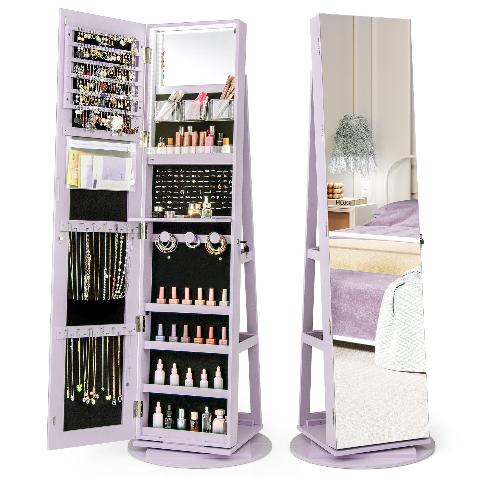 Dieser freistehende Schmuckschrank ist mit 120 Ohrringfächern, 24 Halskettenhaken, 104 Ringfächern, 3 Armbandstangen, 4 Ablagefächern, 2 Taschen, 3 herausnehmbaren Acrylboxen und 1 Lippenstiftablage ausgestattet und bietet geräumigen Platz zum Сортування und Aufbewahren Ihres Schmucks, Ihrer Kosmetikartikel, Sonnenbrillen, Uhren und andere Gegenstände. Zusätzlich ist unser verspiegelter Schmuckschrank mit 2 Schlüsseln abschließbar. Die dreieckige Struktur und die runde Basis machen den Schmuck-Organizer stabiler. Wie sie sehen, lohnt es sich, den Kauf dieses Schmuckschranks in Betracht zu ziehen.