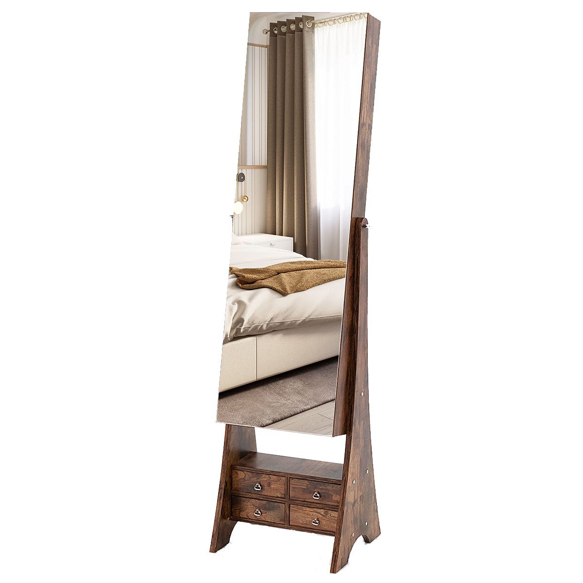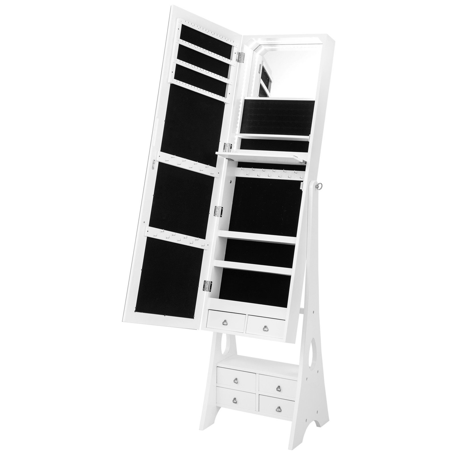 Unser freistehender Schmuckschrank bietet Ihnen eine perfekte Aufbewahrungslösung für Schmuck und Kosmetika. Dieser Schmuckständer verfügt über zwei hochauflösende Spiegel: einen Ganzkörperspiegel und einen Innenspiegel. Der Schmuckschrank lässt sich in drei Winkeln verstellen, sodass Sie den bequemsten Winkel finden. Der Innenraum ist außerdem mit automatisch eingeschalteten LED-Leuchten und einer ausklappbaren Make-up-Ablage ausgestattet, sodass Sie sich problemlos schminken können. Ausgestattet mit Schlitzen, Haken, Schubladen, Regalen und vielem mehr sind alle Ihre Schmuck- und Kosmetikartikel gut organisiert.