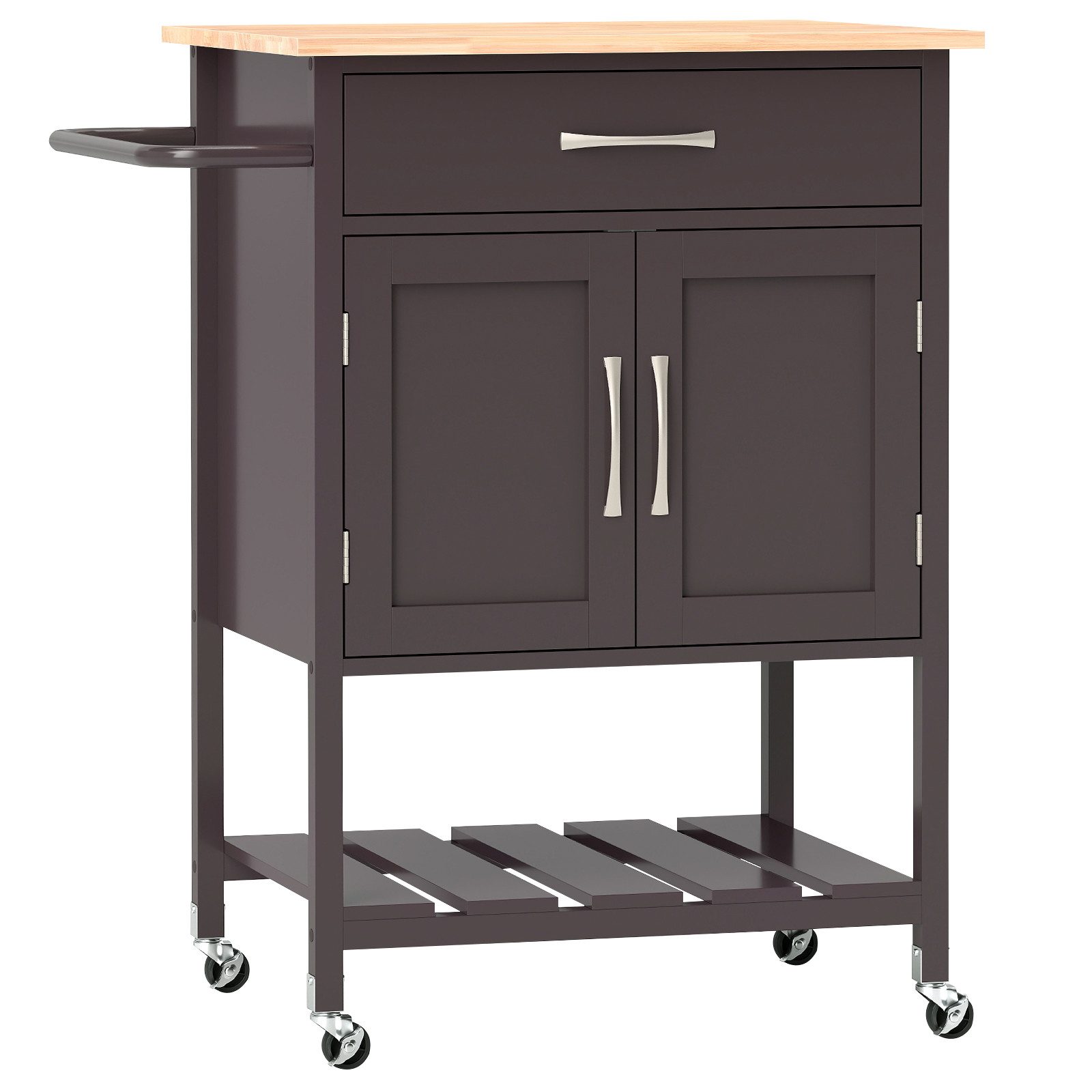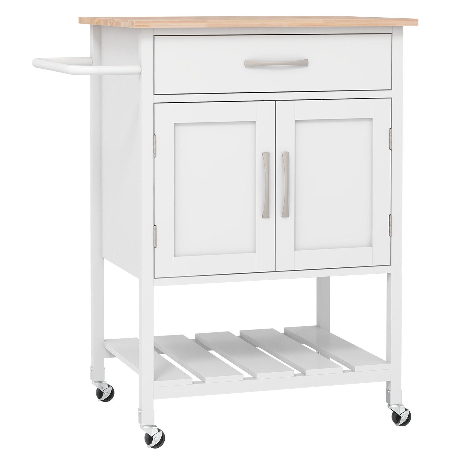 Organisieren Sie Ihre Küchenutensilien mit Leichtigkeit, dank des großzügigen Stauraums, den dieser rollende Kücheninselwagen bietet. Die Arbeitsplatte aus Gummibaumholz ist ideal für die Essenszubereitung oder als zusätzliche Kochstation. Der Rollschrank verfügt über eine praktische Schublade für Besteck, einen geschlossenen Schrank für Küchenutensilien, ein Bodenfach zur Aufbewahrung von Geschirr und Gewürzen und eine Metallstange zum Aufhängen von Handtüchern.