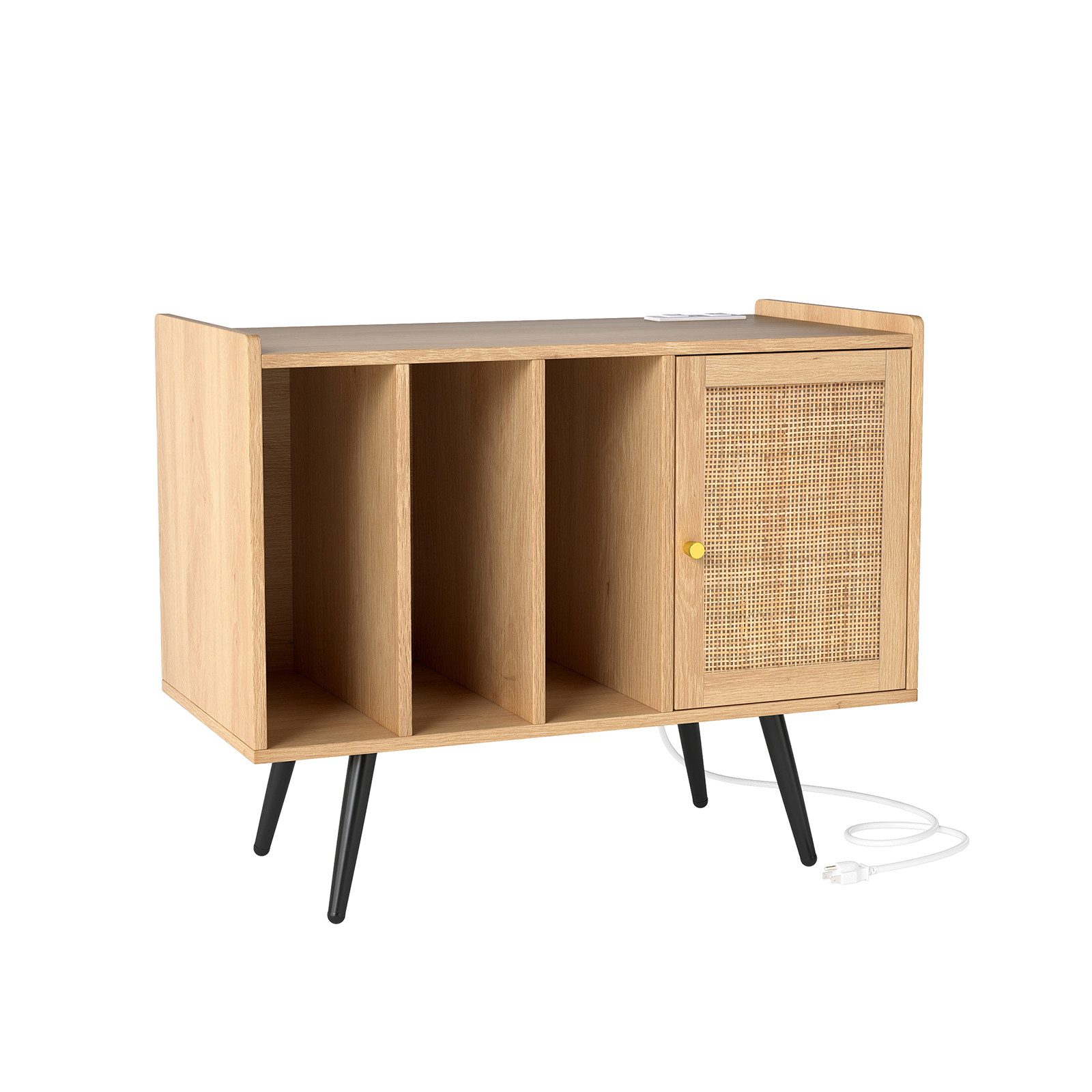 Dieser Plattenspieler-Ständer mit Steckdosenleiste ermöglicht das gleichzeitige Laden mehrerer Geräte. Außerdem vermeidet der Kabeldurchlass Kabelgewirr. Die breite Tischplatte bietet genügend Platz für Ihr Plattenspieler-Setup und 3 offene Regale bieten praktische Aufbewahrungslösungen für Ihre Alben. Darüber hinaus verleiht der natürliche Charme der Rattantür Ihrem Raum Wärme und Textur, während das verstellbare Regal innen flexible Aufbewahrungsoptionen bietet. Für zusätzliche Stabilität und Sicherheit wird der Plattenspieler-Ständer von geneigten Beinen unterstützt und ist mit Kippsicherungs-Kits ausgestattet.