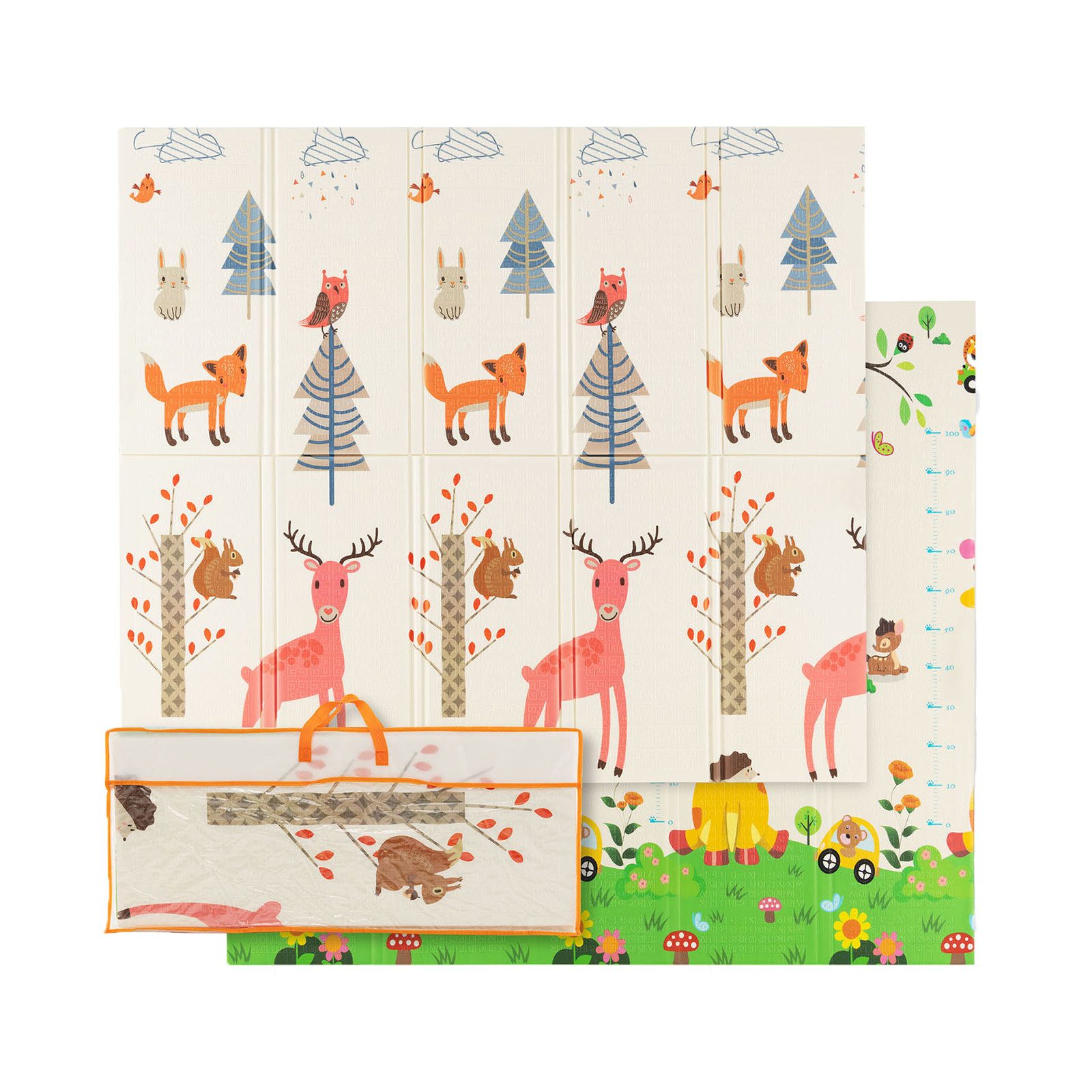 Diese extra große Spielmatte im Format 200 x 180 cm verfügt über ein wendbares Design für vielseitige Spielmöglichkeiten. Eine Seite ist mit farbenfrohen und ansprechenden Giraffenmustern versehen, während die andere Seite niedliche Hirschmuster aufweist. Diese sorgfältig gefertigte Spielmatte bietet eine weiche und gepolsterte Oberfläche, die Ihr Baby beim Spielen vor Stößen und Stürzen schützt. Darüber hinaus sorgt die wasserdichte Oberfläche dafür, dass verschüttete Flüssigkeiten oder Unfälle leicht abgewischt werden können. Das faltbare Design erleichtert den Transport und die Lagerung der Spielmatte. Dank der mitgelieferten Tragetasche können Sie sie außerdem mühelos überallhin mitnehmen.