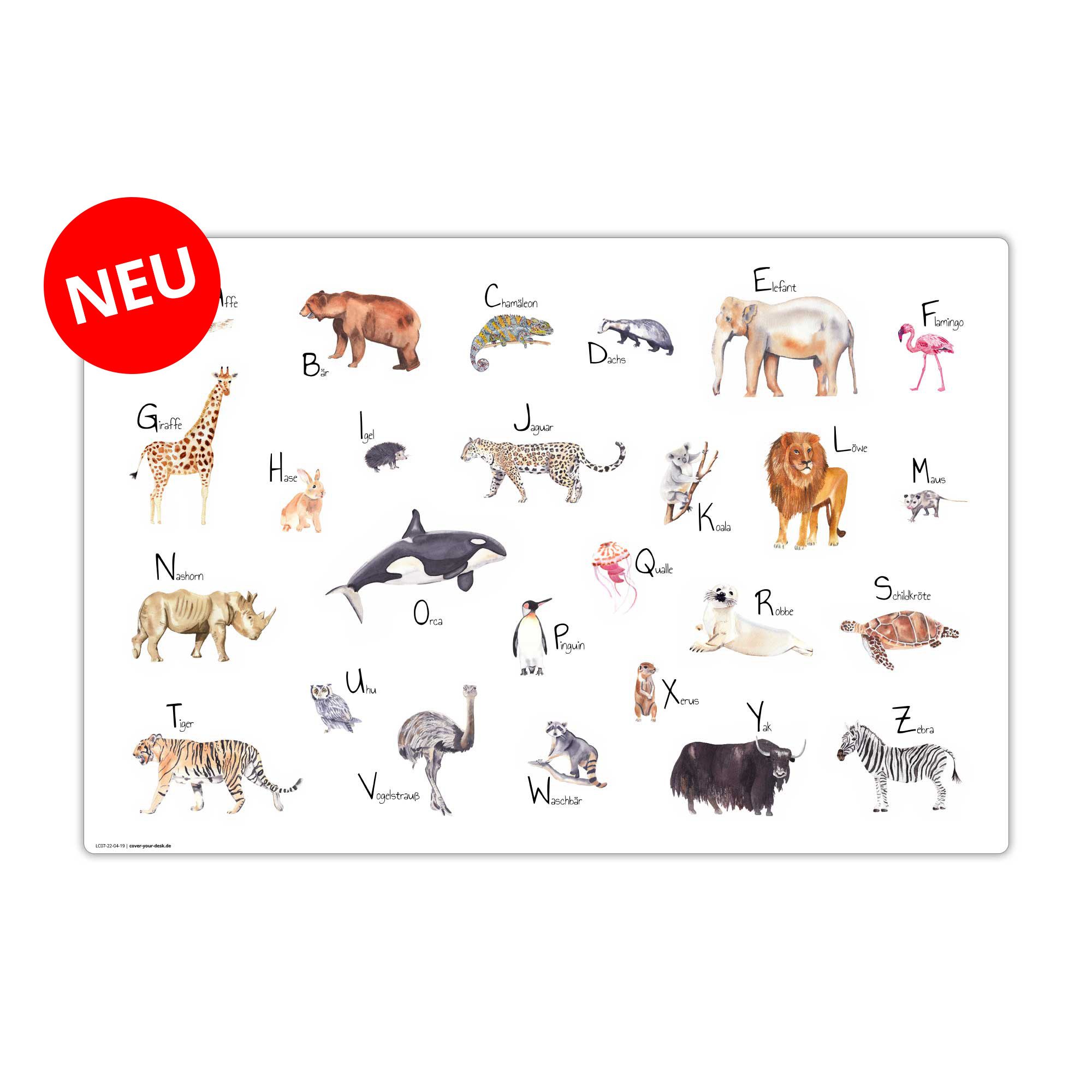 Extra große, flexible Mal- oder Schreibtischunterlage mit handgezeichneten ABC Tieren. Ein auffallender Hingucker weil sie einfach toll illustriert ist und perfekt in jedes Kinderzimmer passt. Lerne das Alphabet zusammen mit der Hilfe deiner Lieblings - Tiere. Hier können die Kleinen malen, kneten .... und sich auf der robusten Unterlage austoben. Eine schöne Geschenkidee zum Geburtstag oder zur Einschulung und für alle die Tiere lieben! Das Format von 60 x 40 cm bietet genug Platz für Tastatur, Maus und weitere Büromaterialien. Unsere Schreibtischunterlagen sind langlebig, umweltfreundlich und zu 100 % recyclebar. Außerdem weisen sie eine hohe Fotodruckqualität auf und werden in Deutschland hergestellt.