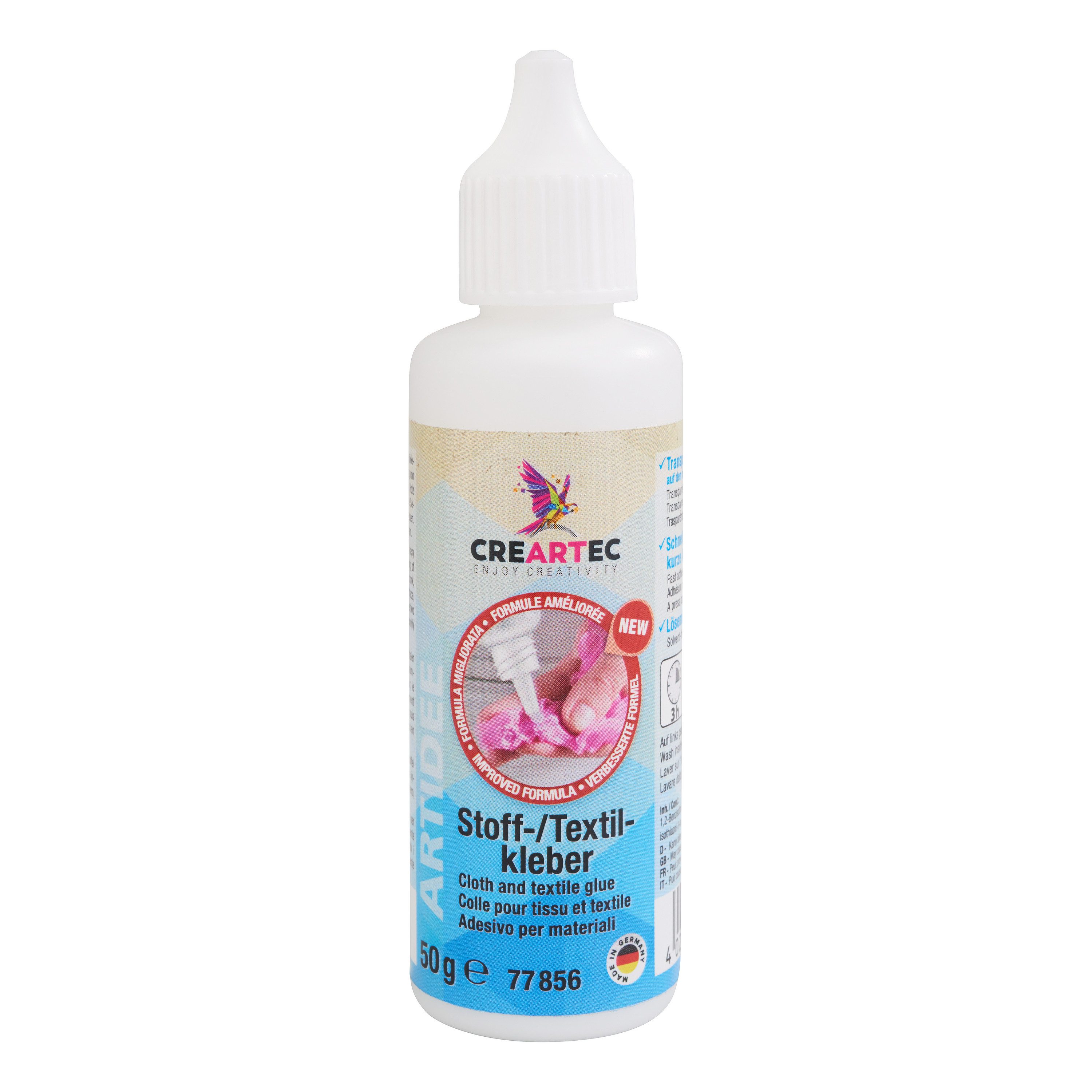 Dieser Kleber in der 50g Tube eignet sich hervorragend für das Kleben von Textilien und anderen synthetischen Stoffen. Zum Verarbeiten ganz einfach die gewünschten Klebeteile fest zusammendrücken. Die Verklebung erfolgt sofort nach dem Auftragen und ist komplett nach 2-3 Stunden abgeschlossen.Oder fixieren Sie Ihre Textilien auch mit anderen Materialien wie z.B. Holz, Pappe, Styropor u.v.m. Einige Textilien werden von dem Textilkleber durchnässt. Nach dem Trocknen ist die Verklebung aber transparent und garantiert einen festen Halt.