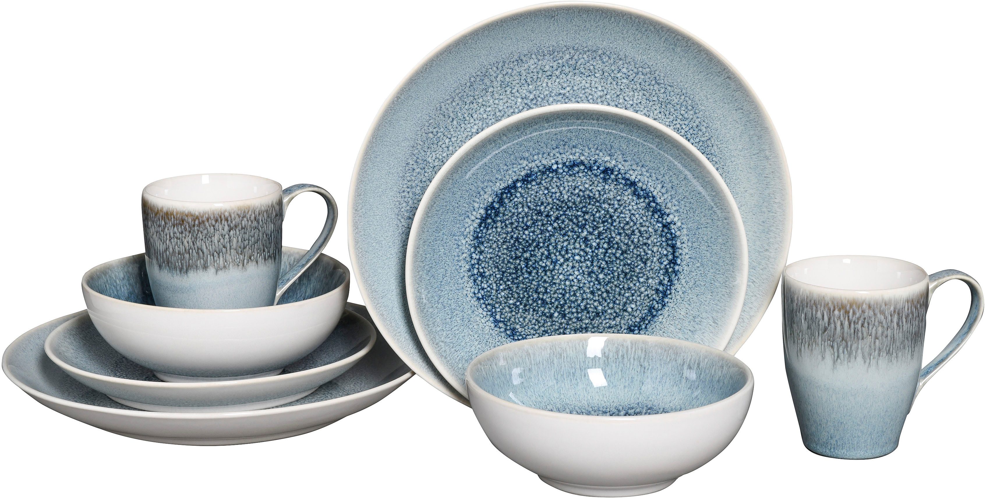 Das Geschirrset aus einer Steinzeug Qualitätsproduktion präsentiert sich mit irisierenden Glasuren in leuchtenden Farben, lieferbar in Sand, Blau, Eisblau und Grün. Die Bicolor Glasur, jeweils außen weiß glänzend, verleiht dem Geschirr tolle optische Effekte mit einer geschmeidigen Haptik.