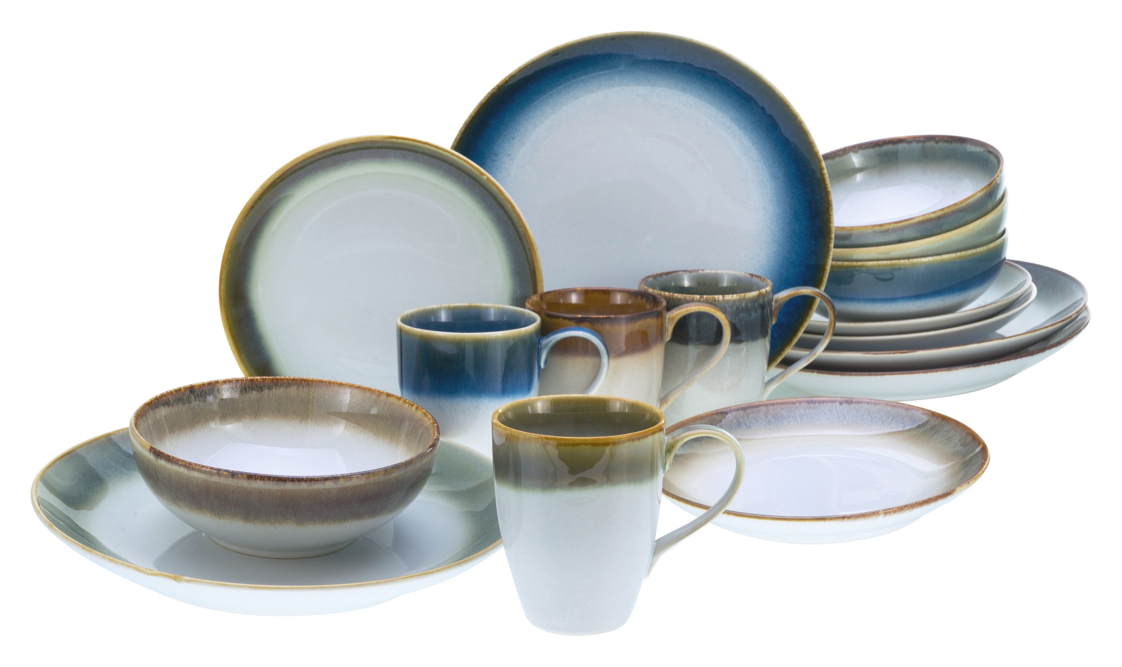 Das Set präsentiert sich mit einer interessanten Spezialglasur in den Farben Blau, Grün, Braun und Grau. An den jeweiligen Kantenentsteht eine farbige Spezialglasur, unregelmäßig und organisch verlaufend.