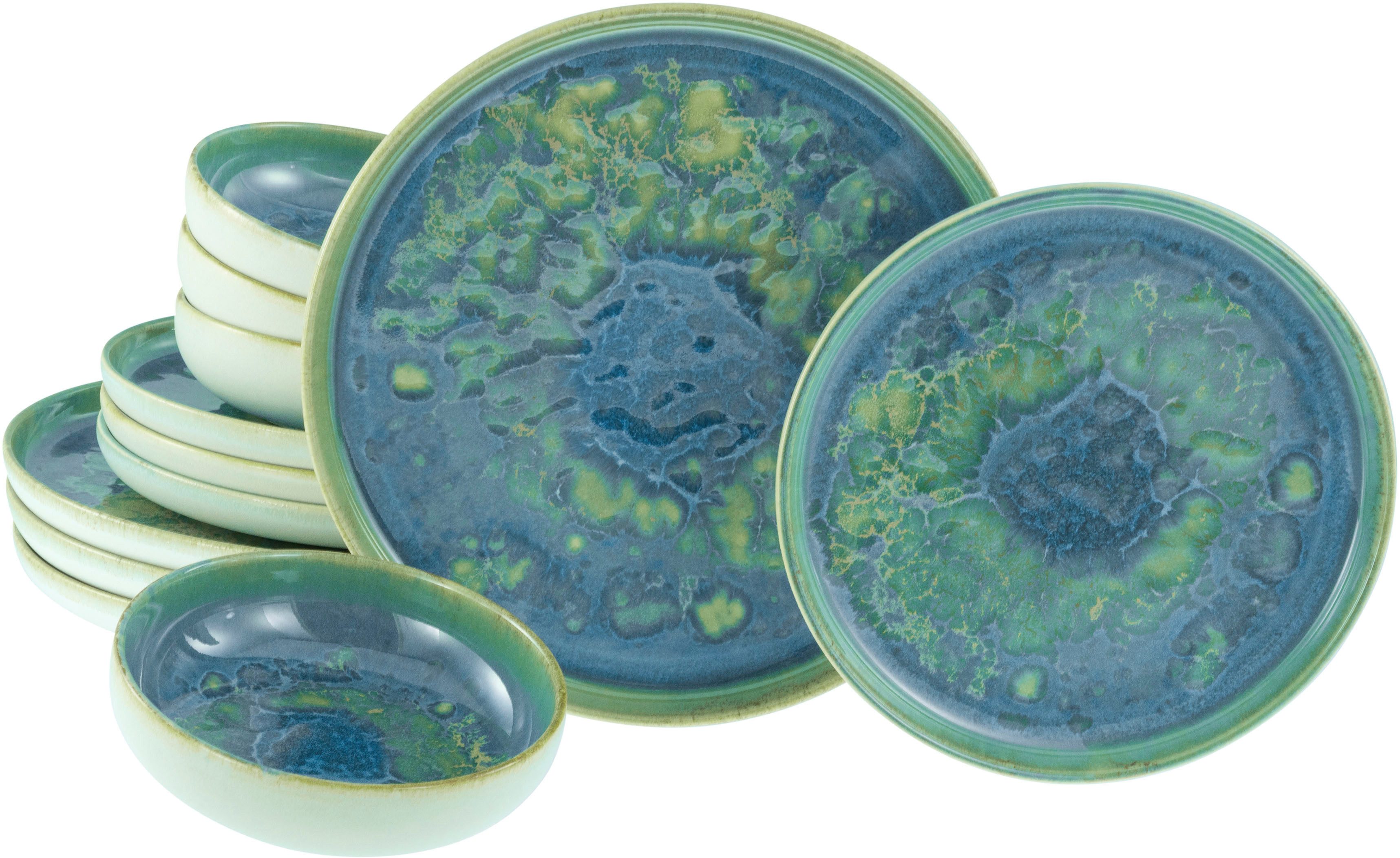 NATURGLASUREN: Mit einer speziellen Technik entstehen einzigartige Oberflächen, die an japanische Seen erinnern. Farben von BLAU bis GRÜN und GOLD machen das Geschirr zum Hingucker