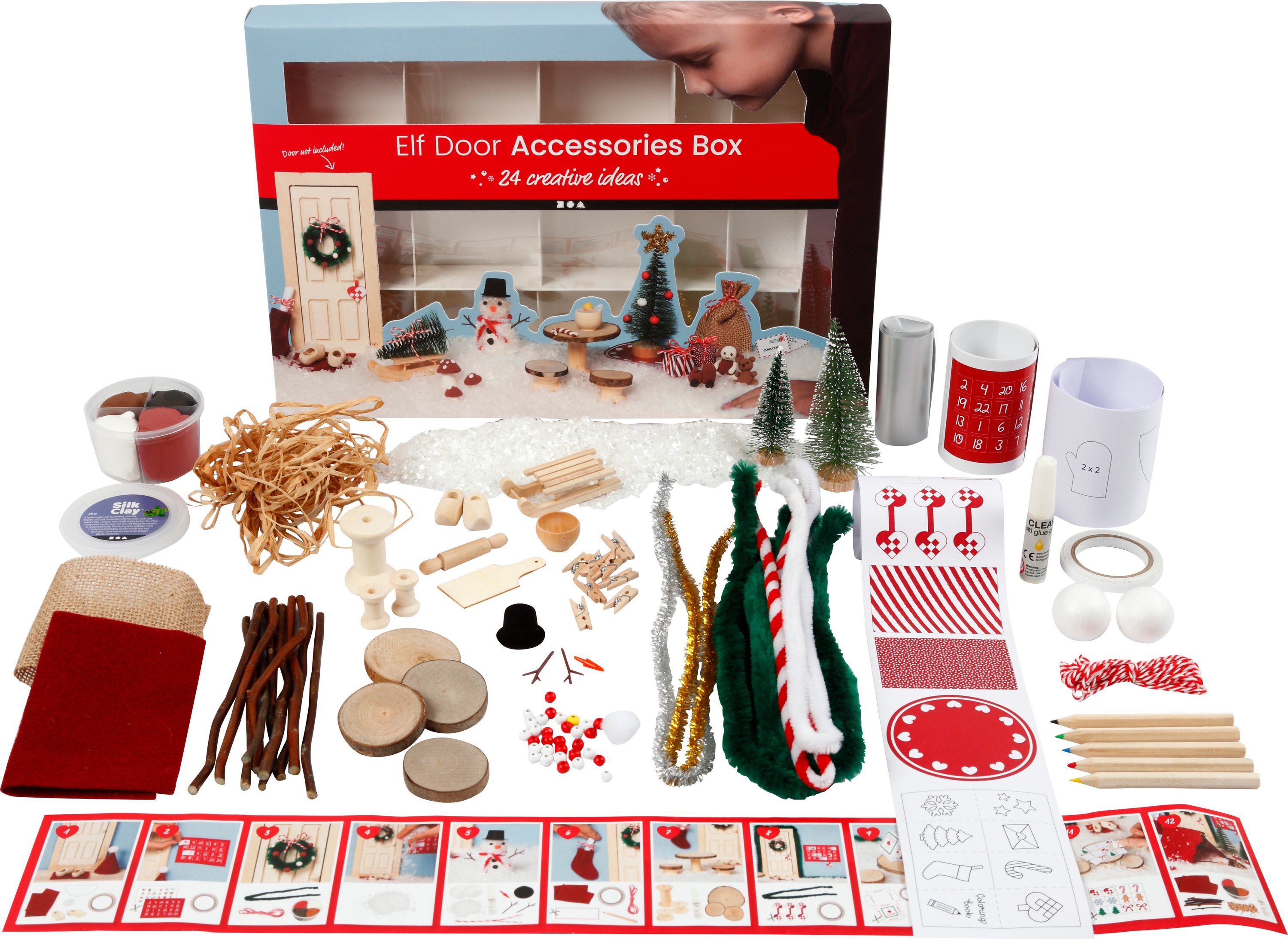 Bastelbox Wichteltür 'Weihnachtsszenen' mit viel Material für 24 Adventsszenen vom 1. Dezember bis zum Heiligabend am 24. Dezember. Der kleine Wichtel, der in der Weihnachtszeit bei Ihnen Zuhause einzieht, kann jeden Tag eine andere kreative Weihnachtsszene mit dem enthaltenen Material darstellen und erweckt die Wichtelwelt zum Leben. Die Ideen reichen von Plätzchen backen über Kranz aufhängen und Tannenbaum fällen bis hin zu Spiele spielen, Briefe schreiben und den geschmückten Weihnachtsbaum mit Geschenken an Heiligabend. Auf der Rückseite der Verpackung befinden sich 24 Inspirationen, die mit dem enthaltenen Material umgesetzt werden können. Die Reihenfolge muss jedoch nicht eingehalten werden, sondern man kann super selbst kreativ werden mit viel Fantasie. Am besten bereiten die Erwachsenen am Abend die Szene vor und am nächsten Morgen staunen die Kinderaugen, was der Wichtel wohl heute vor hat. Mithilfe des innenliegenden Inspirationsblatts mit Überblick zum enthaltenen und benötigten Material gelingen die liebevollen Miniaturszenen. Zusätzlich ist ein QR-Code mit einem Inspirationsvideo auf der Verpackung. Hinweis: Eine Wichteltür, die auf der Rückseite in den Weihnachtsszenen abgebildet ist, ist nicht enthalten.