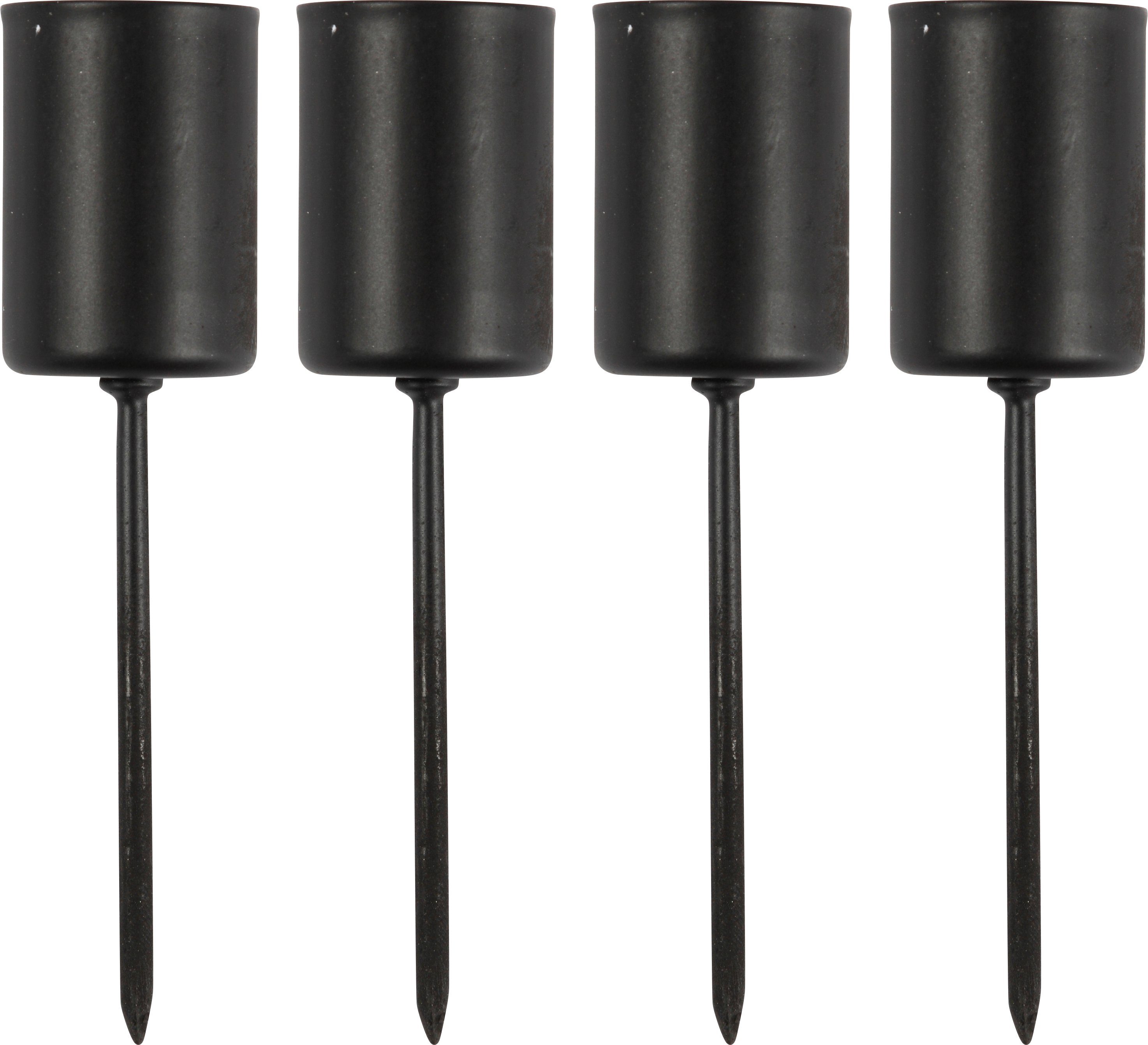 Kerzenhalter mit Spieß für Stabkerzen, 4 Stück mit einer Höhe von ca. 9,5 cm und einem Ø von ca. 22,5 mm. Für konische Kerzen. Die schwarzen Metallhalter lassen sich dank des langen Spießes in die unterschiedlichsten Kränze stecken und sorgen für Halt. Selbstgestaltete Kränze und Tischgestecke lassen sich mit Schleifenbändern, Streuteilen, Trockenblumen, Beeren, Perlen und mehr weihnachtlich gestalten.