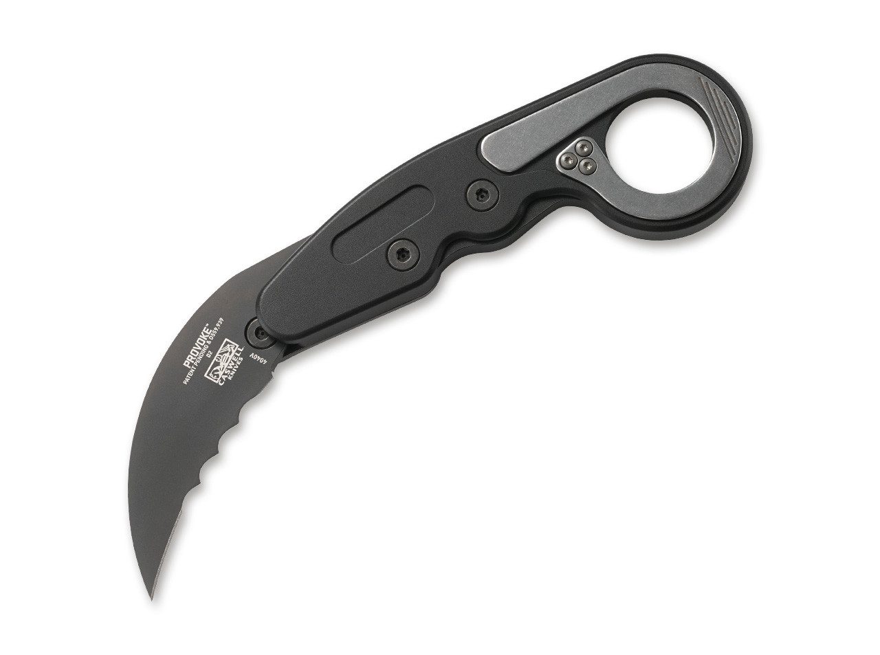 Eine ganz neue Dimension von Klappmesser stellt das CRKT Provoke von Joe Caswell dar, dessen Kinematic genannter Mechanismus mit dem keines anderen Taschenmessers vergleichbar ist. Die auf zwei beweglichen Armen gelagerte Hawkbill-Klinge dreht sich nicht klassisch um eine Achse, sondern wird vom Griff parallel nach vorne herausgeschwenkt und verriegelt. Die Verriegelung des Kerambits wird mit dem in Griff eingelassenen Hebel wieder gelöst. Die Bedienung ist so unkompliziert und intuitiv, dass stets ein sicheres und schnelles Handling gewährleistet ist. Die Griffelemente werden aus 6061 T6-Aluminium gefertigt, während die titannitridbeschichtete Klinge mit Teilwellenschliff aus D2 besteht und beeindruckende 5,3 Millimeter stark ist. Der runde Clip trägt im Gebrauch des Messer nicht auf, lässt sich jedoch mit leichtem Fingerdruck aus seiner Parkposition holen, um das Messer wegzustecken. Das einzigartige Konzept des Provoke beweist anschaulich, dass auch im Bereich der Klappmesser noch grundlegende Innovationen möglich sind.