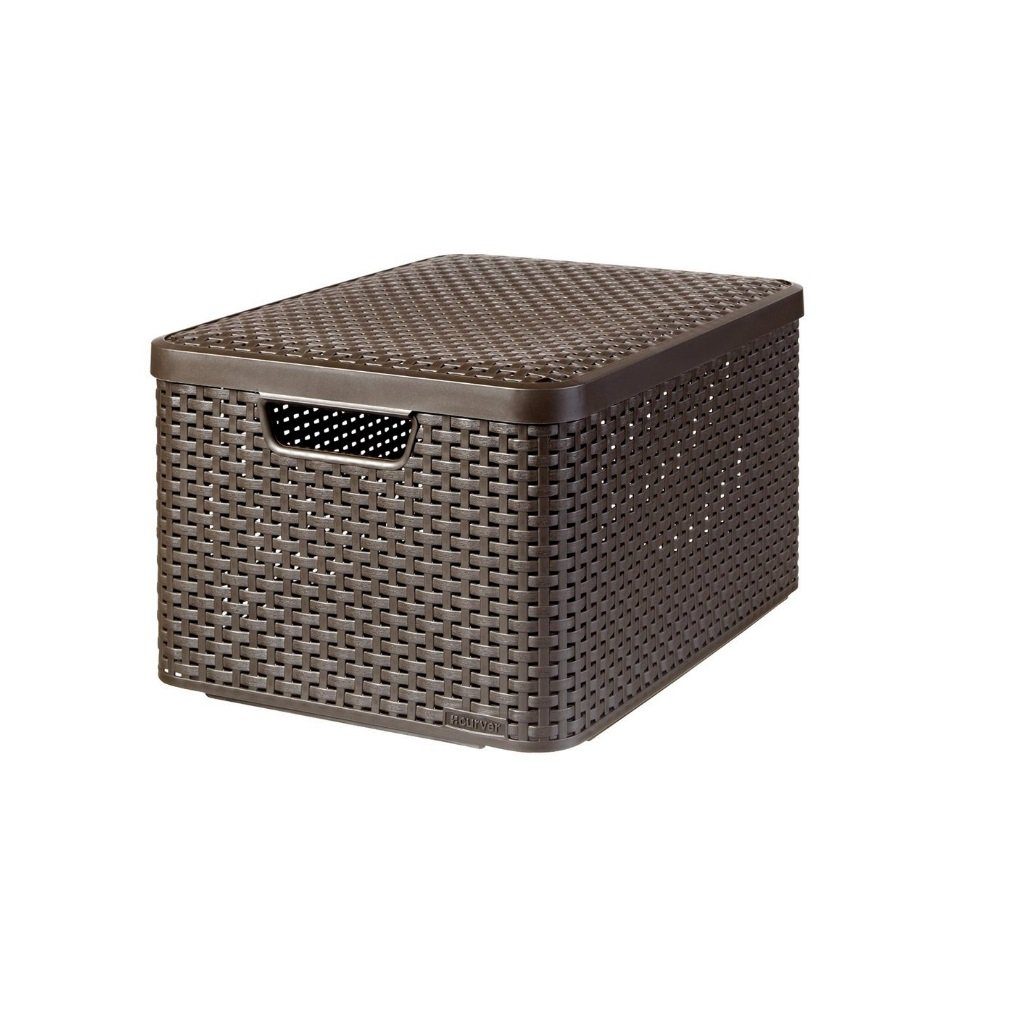 Ein praktischer Aufbewahrungsbehälter aus der Style Curver-Kollektion in Розмір L. Er sieht aus wie ein Rattankorb, besteht jedoch aus leichtem Kunststoff. Dank seines modernen Designs passt der Korb mit Deckel perfekt in verschiedene Innenräume: das Badezimmer, das Schlafzimmer und sogar das Wohnzimmer. Das verwendete Material und die Qualität der Oberfläche garantieren, dass die im Korb gelagerten Gegenstände unempfindlich gegen Beschädigungen und Schmutz sind. Aufgrund der Tatsache, dass es mit einem Deckel ausgestattet ist, kann es als Aufbewahrungsbehälter verwendet werden, zum Beispiel in Schränken oder auf dem Dachboden, oder auf eine Kommode gestellt werden.