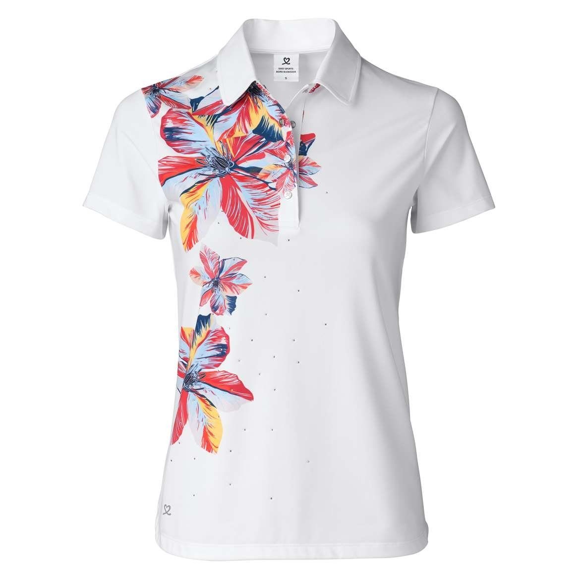 Nance von Daily Sports ist ein kurzärmeliges Golfhemd. Gedrucktes Muster mit Strasssteinen für einen femininen Look. Kleine Seitenschlitze. Knopf vorne. Schnelltrocknendes Material dehnen. Ausgestellte Passform. Leicht