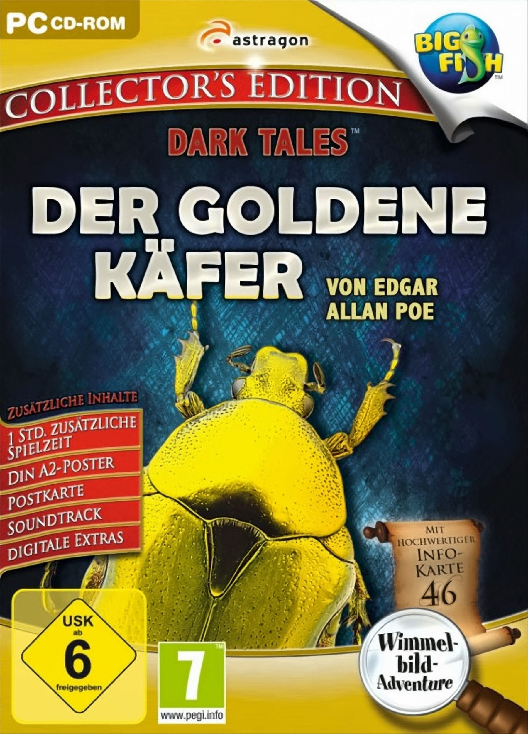 Spielbeschreibung | Inhalt der Collectors Edition:- Bonuskapitel- Desktop-Hintergründe- Konzeptentwürfe- Bildschirmschoner- Filme- MusikIm vierten Teil der beliebten Dark Tales-Reihe wird Dtective Dupin von seinem Freund William LeGrand zu Hilfe gerufen, der glaubt, auf der Spur eines Jahrhunderte alten Schatzes zu sein. Sie begleiten Dupin auf seiner Reise und müssen feststellen, dass Sie nicht alleine auf der Jagd nach diesem Schatz sind. Wer ist die vermummte Gestalt, die Ihnen immer wieder über den Weg läuft und Warnungen ausstößt? Und wer die geheimnisvolle verschleierte Frau mit dem Hang zu giftigen Substanzen?Hier sind all Ihre detektivischen Fähigkeiten gefordert, um die Rätsel von Dark Tales: Der Goldkäfer von Edgar Всіn Poe zu lösen.FEATURES:- Aufwändig gestaltete und detaillierte Grafik- Fordernde Rätsel- Abwechslungsreich gestaltete Wimmelbilder- Schwierigkeitsgrad einstellbarSprache/Untertitel: Deutsch |