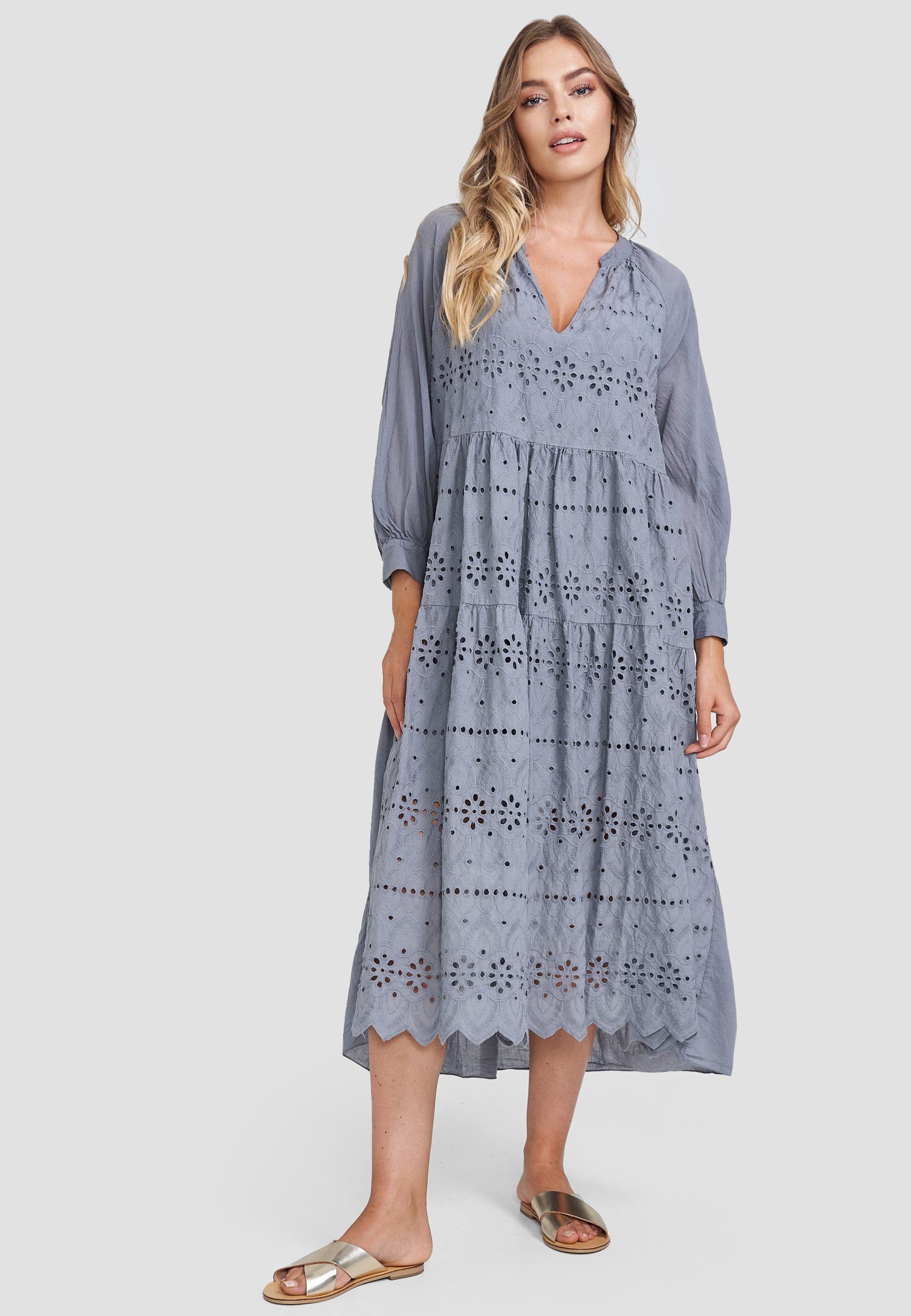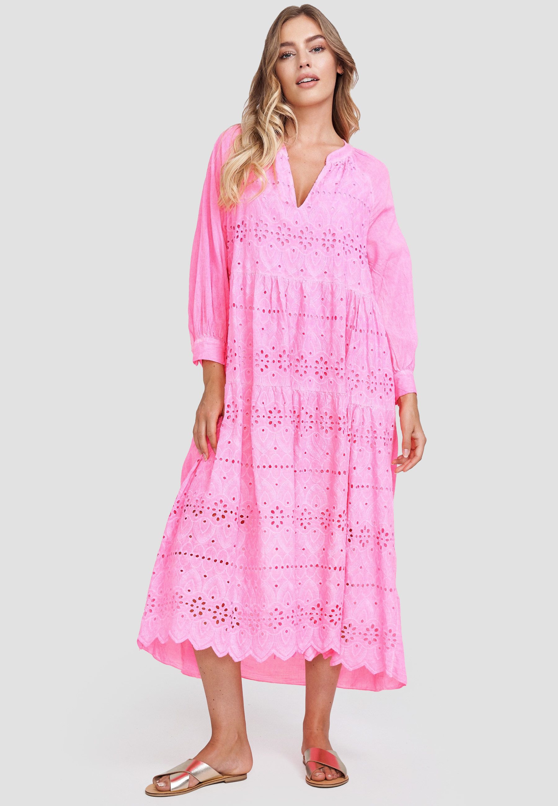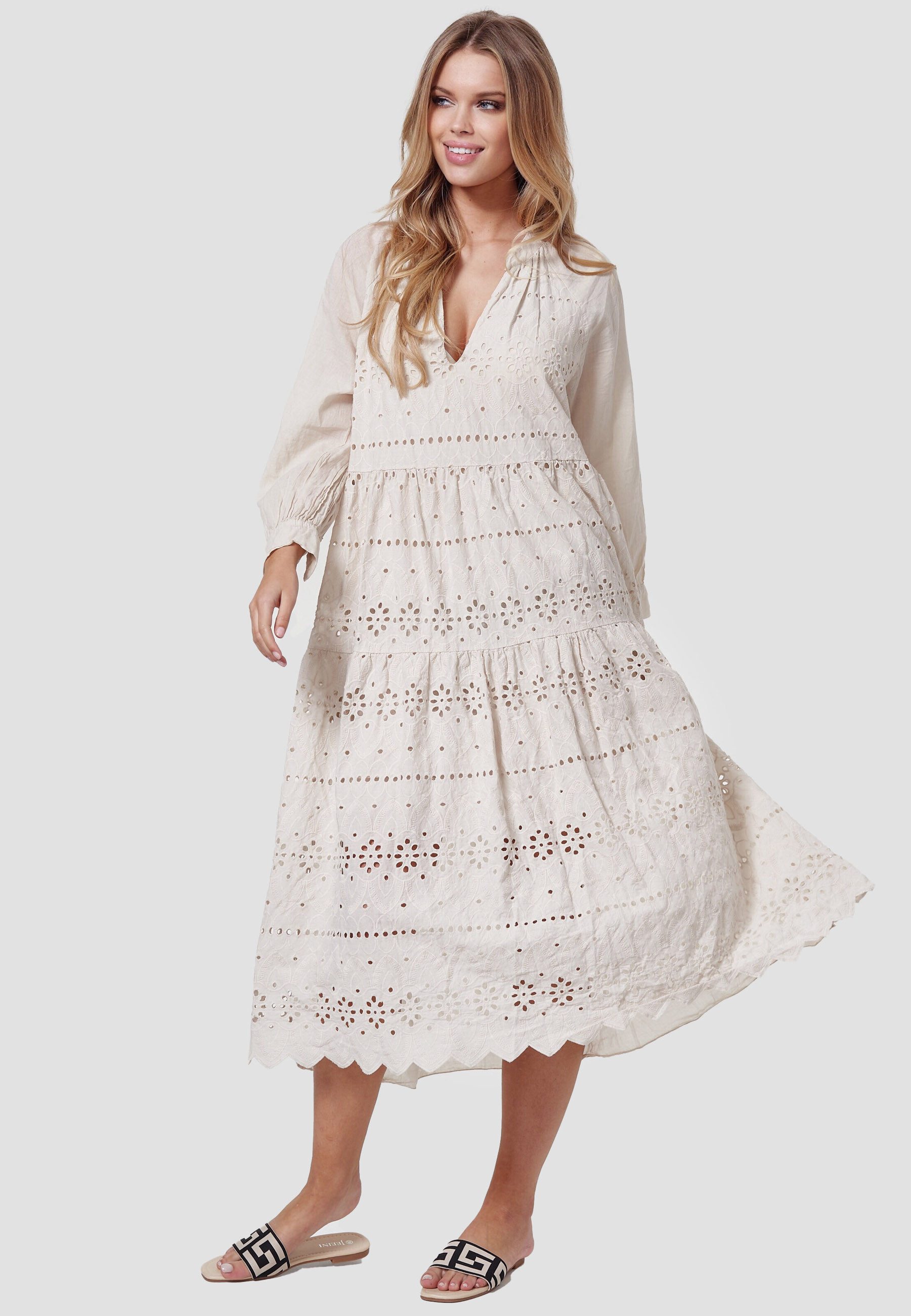 Dieses stilvolle Freizeitkleid von Decay ist ein echter Hingucker für jeden Anlass. Das moderne Lochmuster verleiht dem Kleid eine trendige, aber dennoch dezente Note, die es zu einem wahren Kombinationstalent macht. Der feminine V-Ausschnitt, die langen Ärmel mit Manschetten und der ausgestellte Schnitt sorgen für eine schmeichelhafte Silhouette und viel Bewegungsfreiheit. Dank der hochwertigen Verarbeitung aus 100% Baumwolle bietet das Kleid ein besonders angenehmes Tragegefühl – ideal für warme Tage oder entspannte Freizeitmomente. Die Einheitsgröße passt sich dabei bequem verschiedenen Körperformen an.