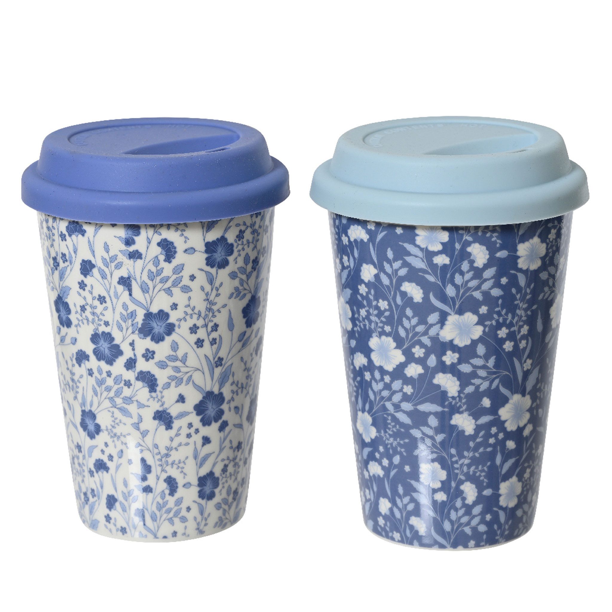 PRODUKT: To Go Becher / INHALT: 1 Stück (Auslieferung nach Zufallsprinzip) / GRÖSSE (DxH): ca. 10 x 14,4 cm / VOLUMEN: ca. 390 ml / MATERIAL: Keramik - Porzellan / FARBE: blau -
