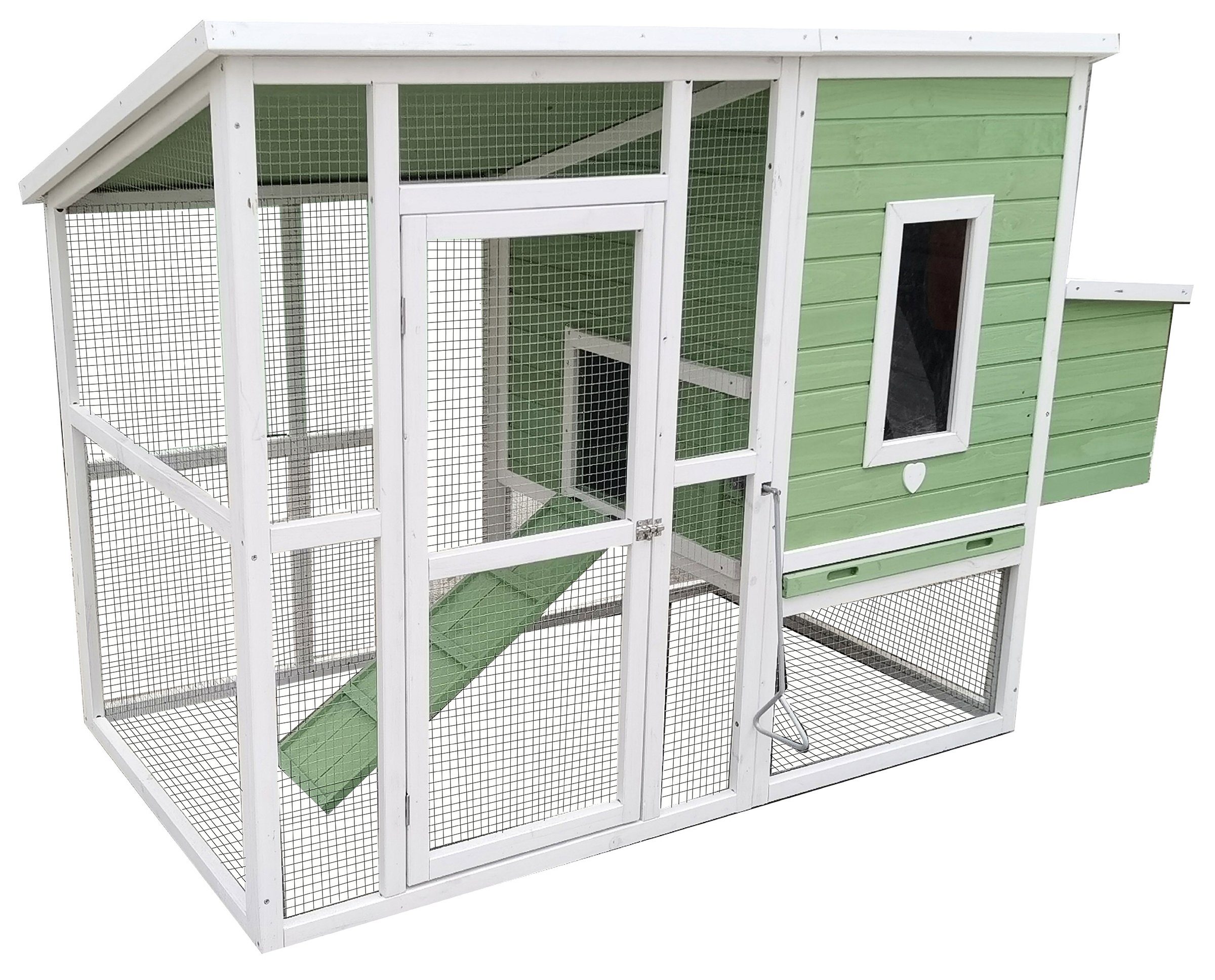 Wenn Sie sich für die Haltung von Federvieh begeistern, wird Sie der Hühnerstall Lotti in der bekannten Dehner Lieblinge Qualität sofort in seinen Bann ziehen. Das Geflügelhaus ist eine Zierde in jedem Garten und bietet zahlreiche Features, die den Produzenten leckerer Frühstückseier ein schönes und artgerechtes Umfeld bieten. Schon die ländliche Architektur sowie die farbliche Gestaltung des Stalls und des einbezogenen Freiluftbereiches sind attraktiv anzusehen. Das Hühnerhaus enthält zwei gemütliche Sitzstangen aus Holz, auf denen sich Ihre Lieblinge wohlfühlen können.