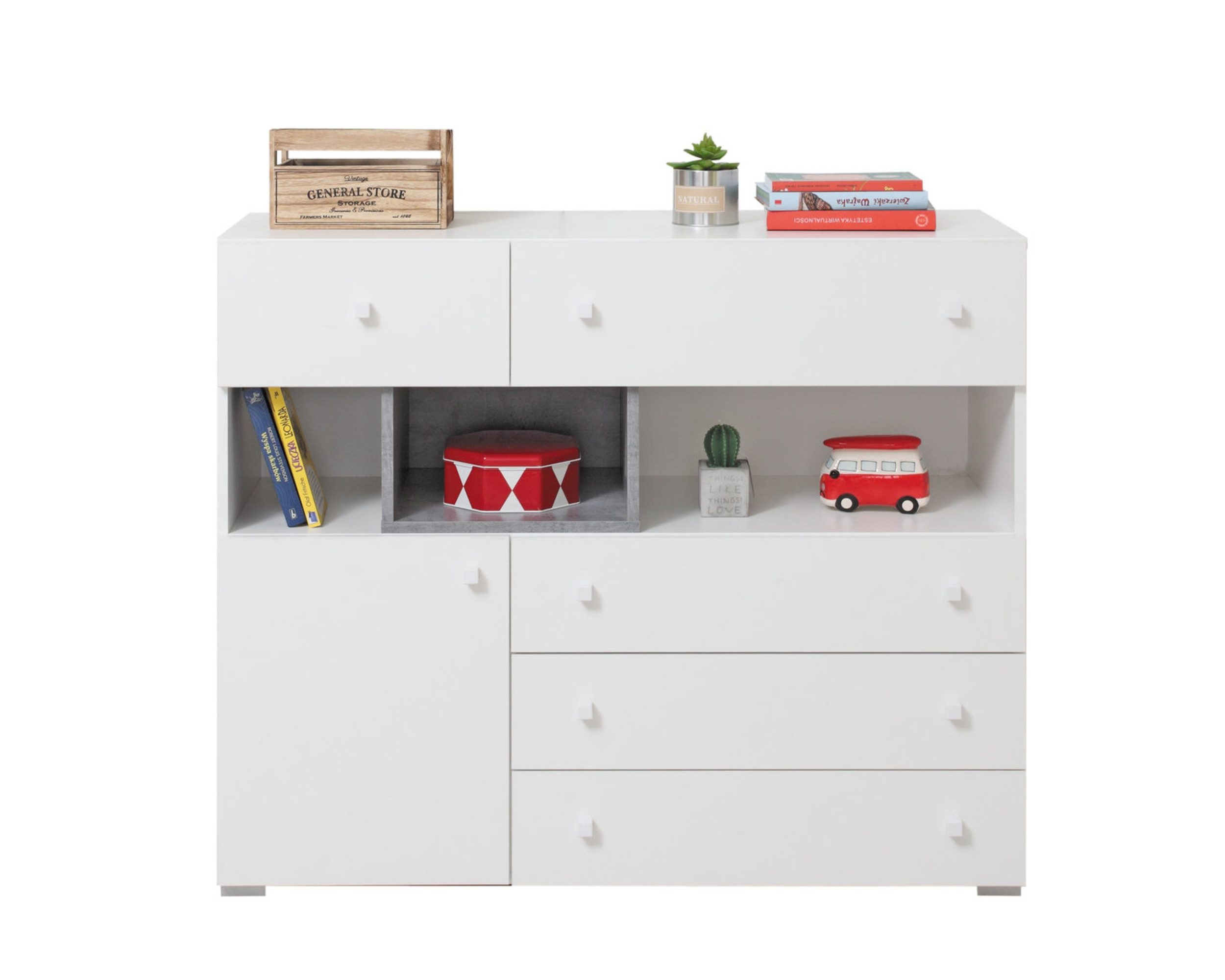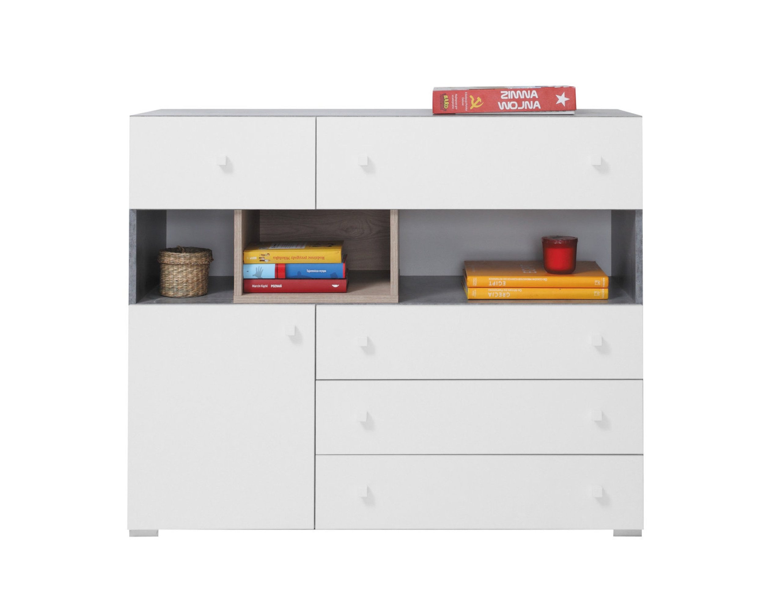 Ideal für moderne Jugendzimmer! Diese Kollektion besteht aus 16 stilvollen Elementen, erhältlich in Weiß Lux/Beton und Beton/Weiß Lux/Eiche. Gefertigt aus hochwertiger Möbelplatte, garantieren die Möbel Langlebigkeit und Robustheit.