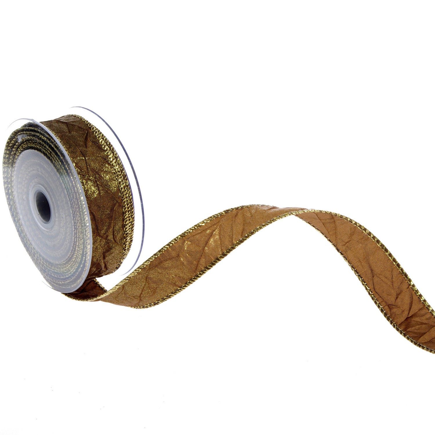 Das braune Metallic-Crashband wird durch seinen goldenen Glanz zu einem echten Blickfang, ob für Dekorationen oder als Geschenkband. Durch die Drahtkante lässt sich das Band einfach formen und Sie können damit Ihren Tisch dekorieren oder diverse andere Dekoartikel verschönern. Die warme Kombination aus Braun und Gold passt gut zu Creme- und Rottönen.