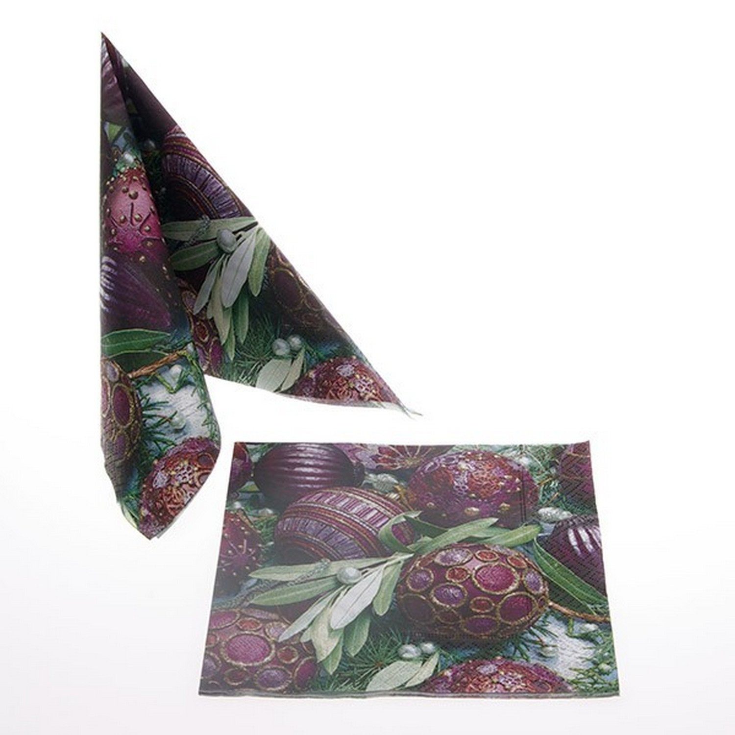 Viele reich verzierte Tannenbaumkugeln sowie Koniferen-, Tannen- und Mistelzweige schmücken diese Serviette. Wer seine weihnachtliche Tischdeko eher traditionell bevorzugt und farblich in Purpur- und Aubergine-Tönen hält, liegt mit diesem Motiv genau richtig.