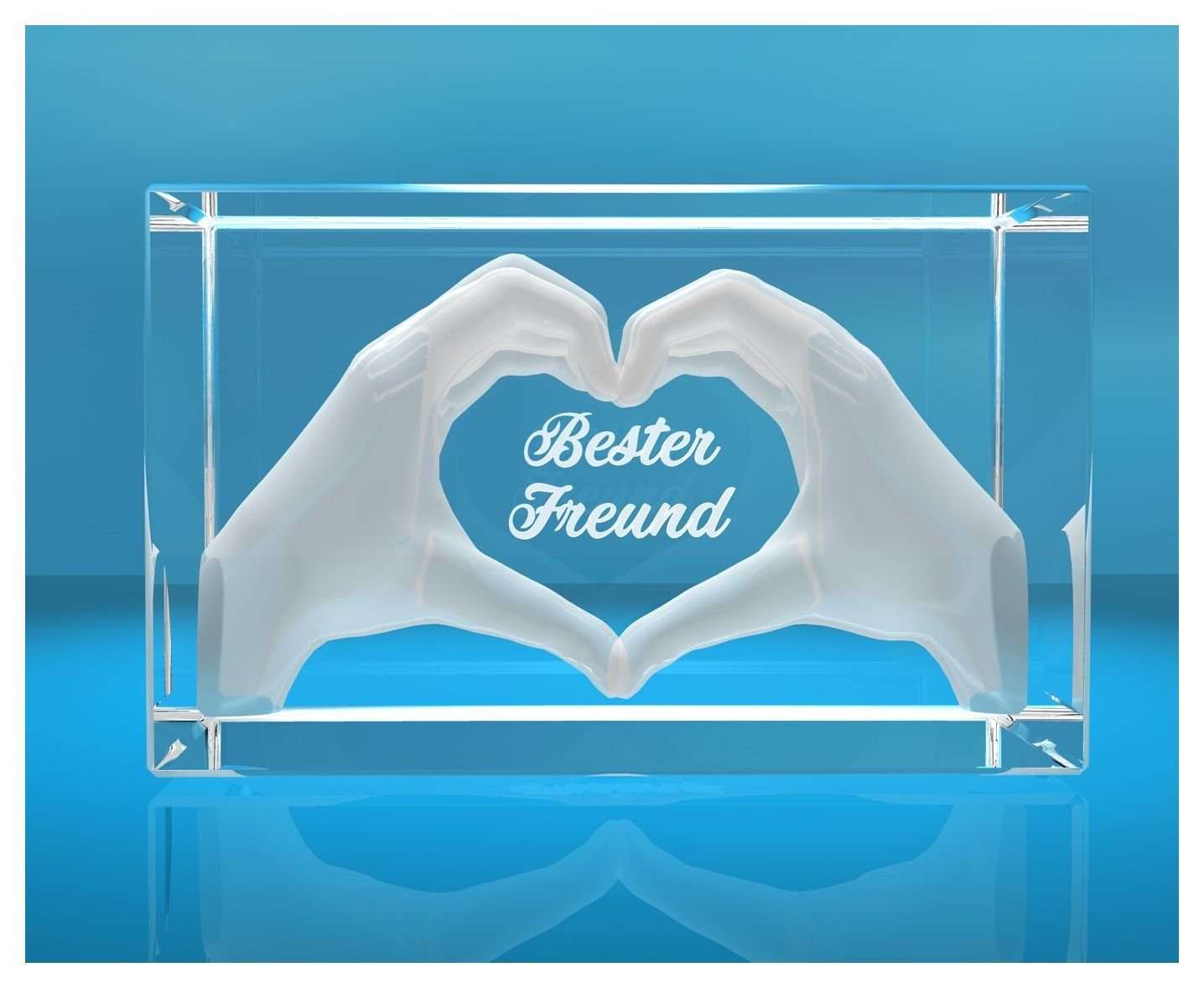 Der 3D Glasquader "Herz aus Händen" mit Gravur ist ein perfektes Geschenk, das Ihre Wertschätzung und Zuneigung zu einem besonderen Menschen zum Ausdruck bringt. Dieses kunstvolle Stück zeigt die Silhouette zweier Hände, die ein Herz formen und symbolisiert dadurch die tiefe Verbindung und Freundschaft, die Sie mit Ihrem "besten Freund" teilen. Die raffinierte 3D-Lasergravurtechnik verleiht dem Glasquader eine beeindruckende Tiefenwirkung, die das Herz aus jeder Perspektive wunderschön zur Geltung bringt. Ob als dekoratives Highlight im Wohnzimmer, im Büro oder als persönliches Erinnerungsstück auf dem Nachttisch, dieses elegante und zeitlose Design wird garantiert die Blicke auf sich ziehen. Gefertigt aus hochwertigem Kristallglas, steht dieser Glasquader für Langlebigkeit und Qualität. Die individuell anpassbare Gravur "Bester Freund" macht dieses Objekt zu einem einzigartigen und unvergesslichen Geschenk, das Ihre Freundschaft auf ewig festhält.
