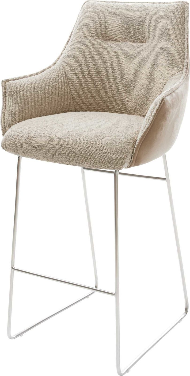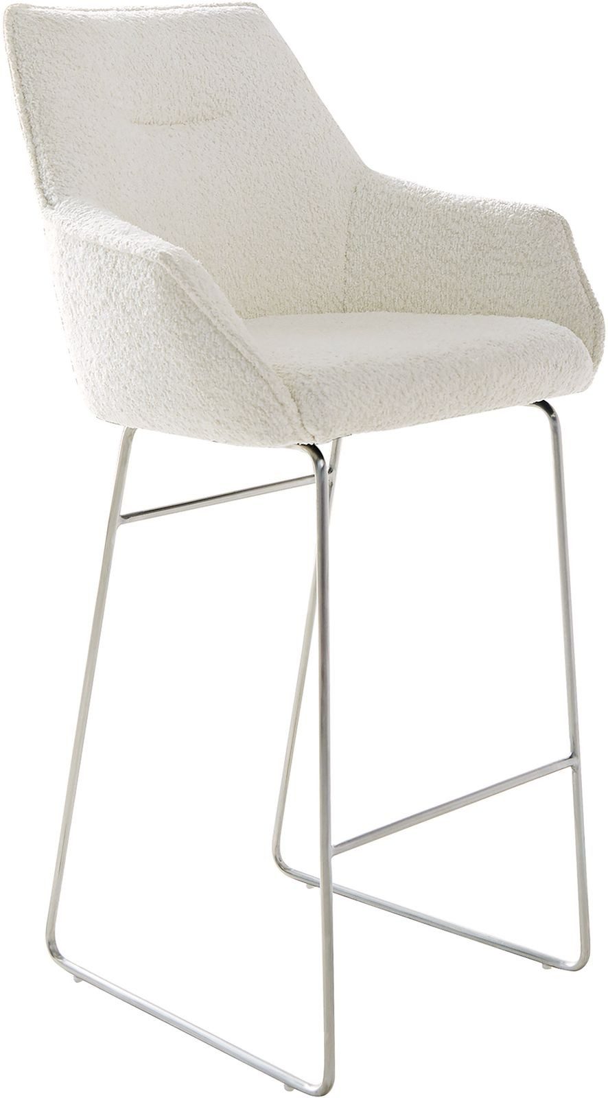 Der Barstuhl wurde mit einem besonders weichen und pflegeleichten Bouclé Stoff bezogen, der sich in einem warmen Weiß präsentiert und dem Esszimmer einen eleganten Look verleiht.