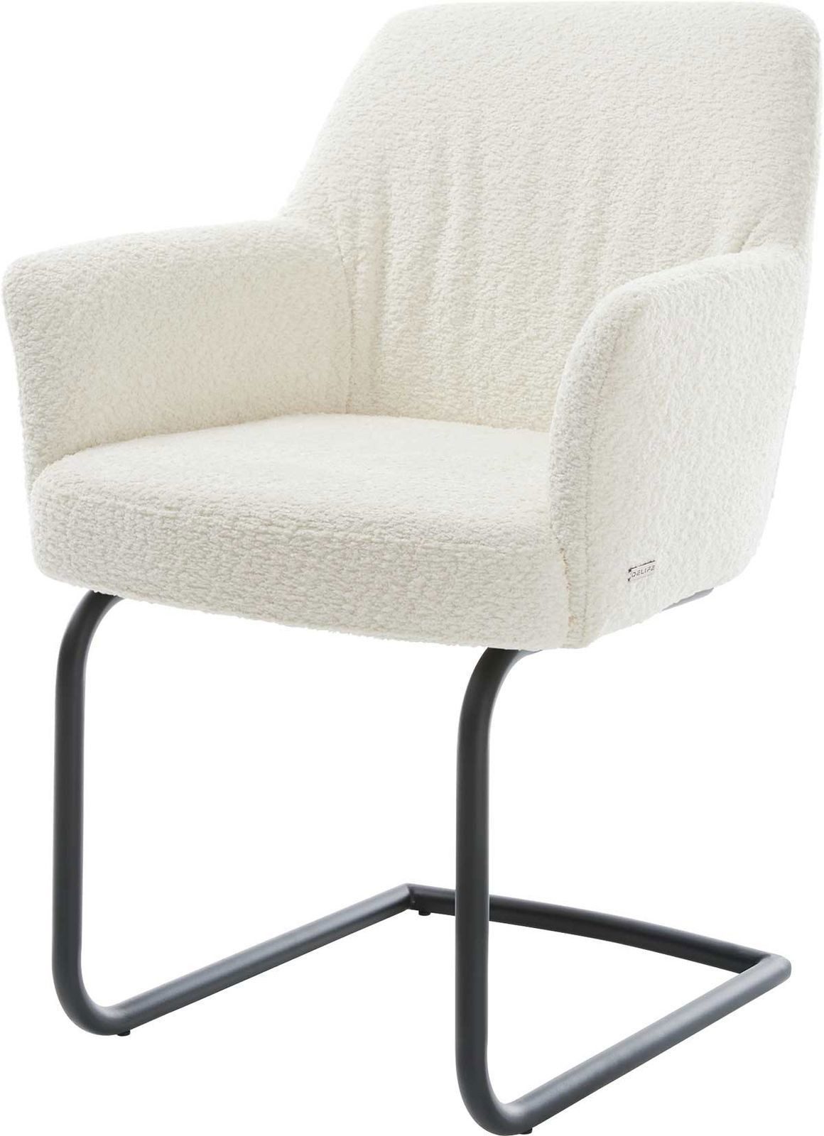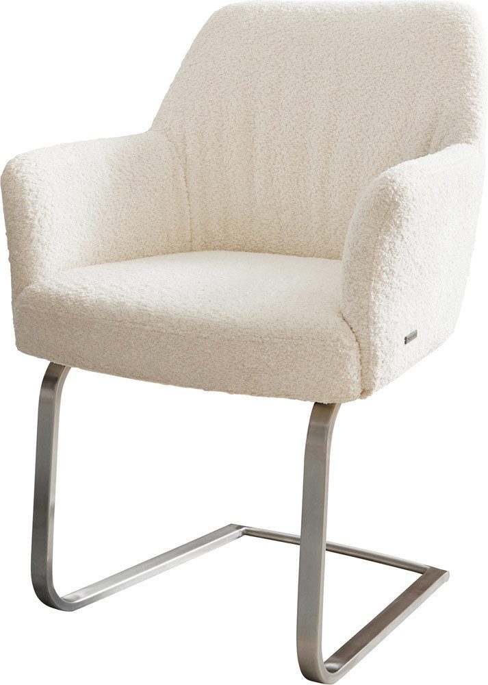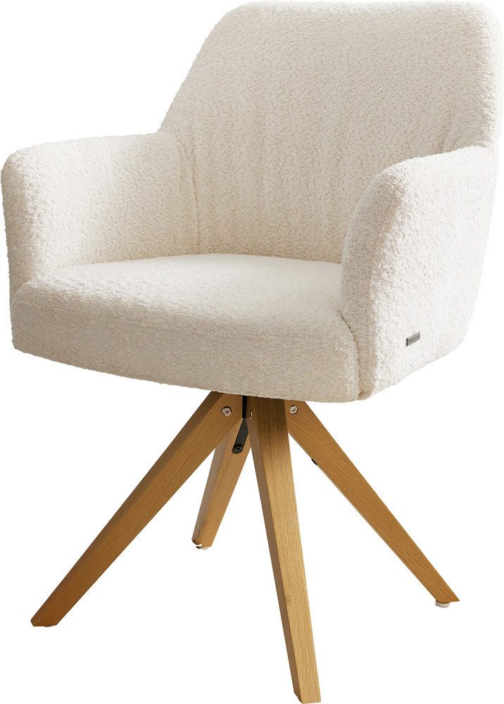 Der Esszimmerstuhl wurde mit einem besonders weichen und pflegeleichten Bouclé Stoff bezogen, der sich in einem warmen Weiß präsentiert und dem Esszimmer einen eleganten Look verleiht.