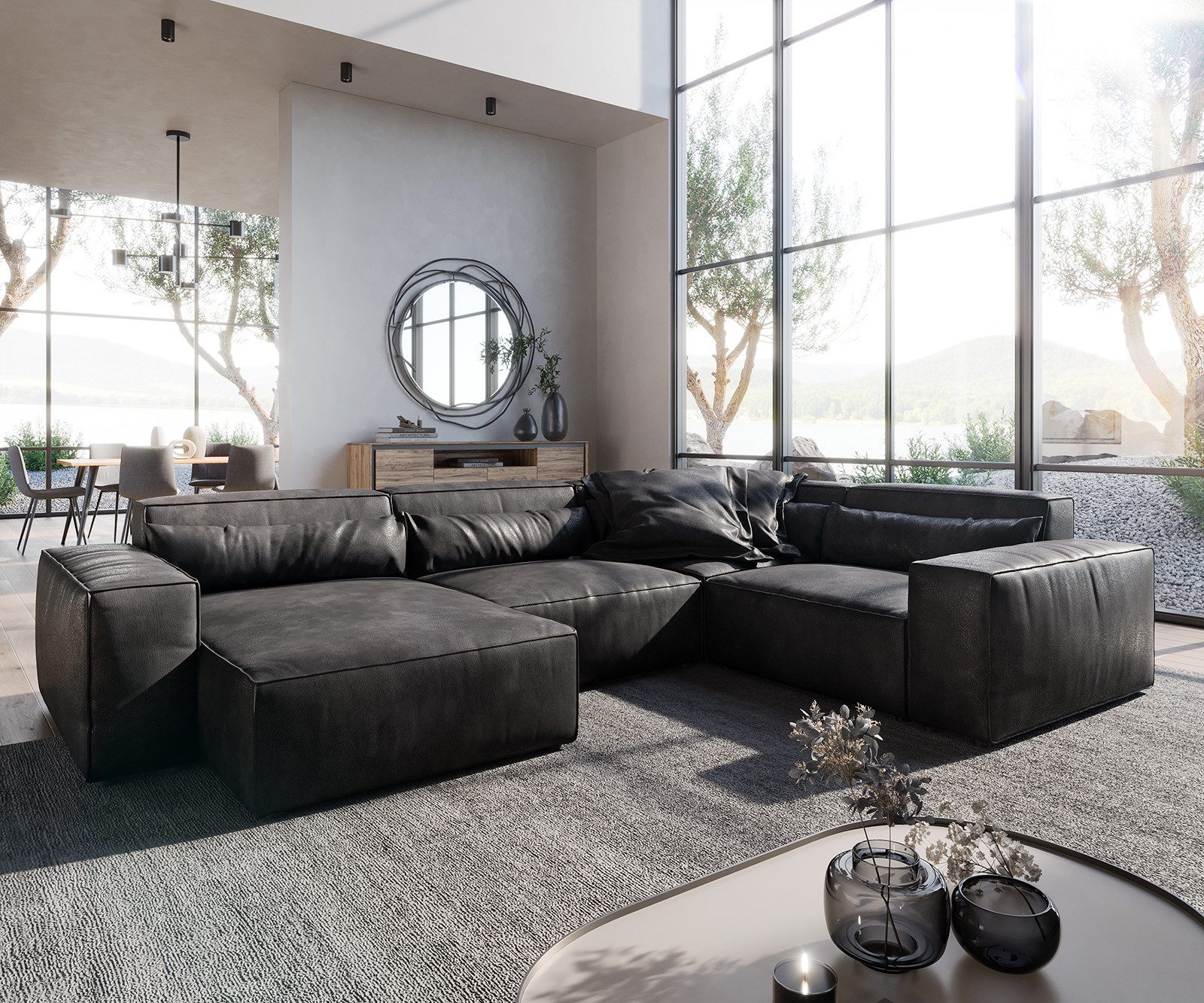 Die Wohnlandschaft Sirpio ist ein einmaliges Möbelstück, das durch seine kubische, bodentiefe Formgebung mit breiten Armlehnen und einer tiefen Sitzfläche begeistert. Das Design wird durch eine aufwendige Biese veredelt. Sirpio wurde rückenecht bezogen und ist variabel stellbar. Eine Vielzahl loser Kissen erhöhen den luxuriösen Sitzkomfort.