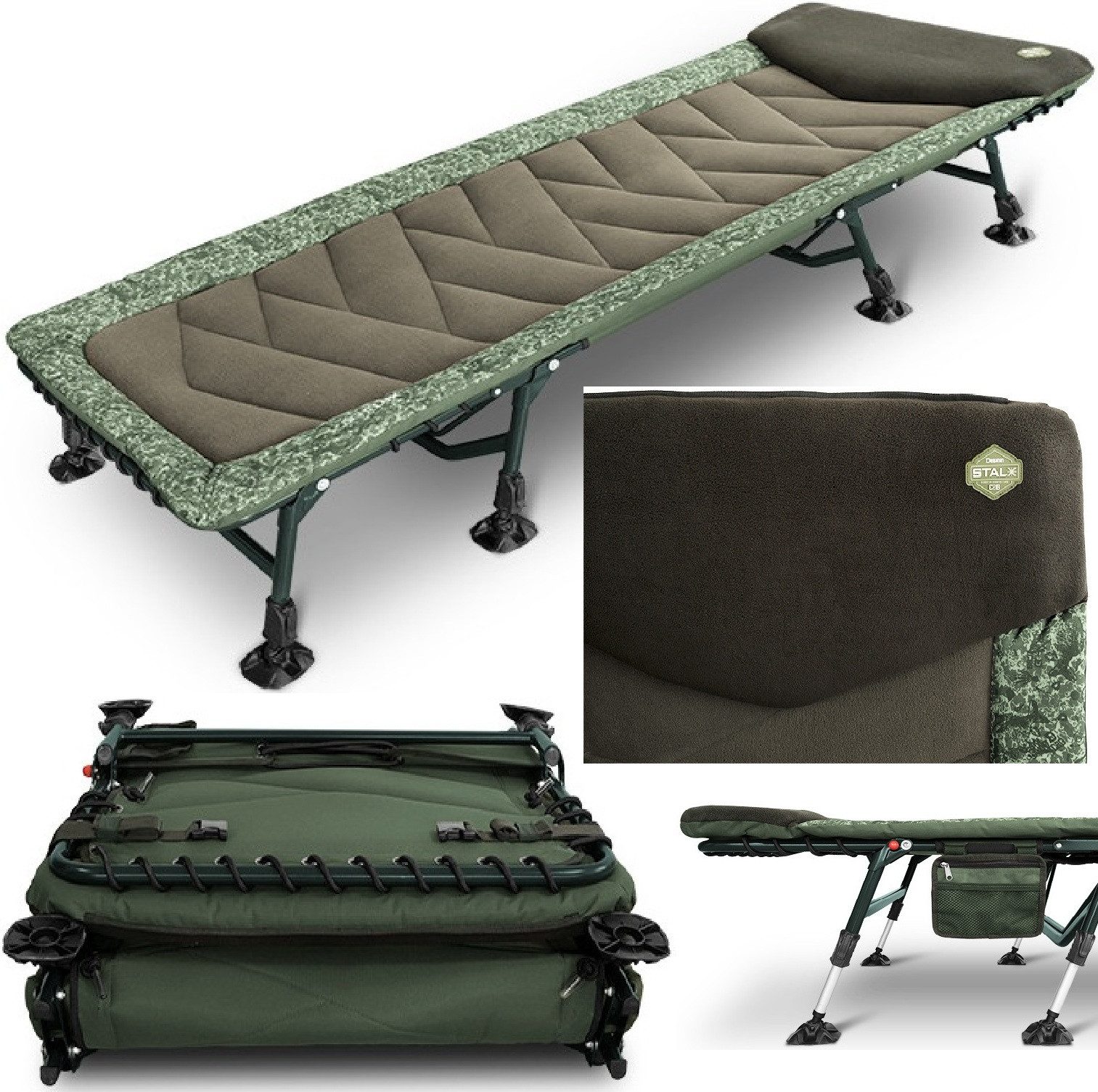 Die maximal bequeme Liege mit acht Beinen, die Ihren Aufenthalt am Wasser zu einer perfekten und wohlverdienten Erholung macht. Die Grundlage der Liege ist eine sehr stabile Konstruktion, die sich neben der hohen Festigkeit durch das geringe Gewicht und die Widerstandsfähigkeit gegen die mechanischen Beschädigungen und äußeren Einflüsse auszeichnet. Die Konstruktion ist mit einer dick gepolsterten Matratze mit den spektakulären Nähten ausgestattet, die dieser Liege ein Markenzeichen der Originalität verleiht. Die Matratze ist auf der Oberfläche mit dem Vlies bedeckt, wodurch sie sich sehr angenehm anfühlt und an den kalten Tagen perfekt wärmt. Außerdem ist die Matratze rundherum mit einem langlebigen 600D-Gewebe in einem einzigartigen C2G-Design ausgestattet. Für den maximalen Komfort gibt es im oberen Kopfteil ein extra gepolstertes Fleece-Pannel in Dunkelgrün. Im Mittelteil ist die Matratze an der Unterseite zusätzlich verstärkt und kann mit einer starken Gummischnur in ihrer Härte reguliert werden. Всі 8 Beine sind mit den stabilen, flexiblen Füßen ausgestattet, so dass sie sich auch dem unebenen Gelände anpassen können. Außerdem ist das Beinpaar unter dem Kopfteil mit einem Verriegelungsmechanismus ausgestattet, der das Aufklappen der Liege erleichtert und ein unerwünschtes Zusammenklappen oder Verrutschen verhindert. Die Liege ist außerdem mit zwei Gurten mit den massiven Clips an den Seiten ausgestattet, die verhindern, dass sie sich von selbst aufklappt, was den Transport in dem zusammengeklappten Zustand erleichtert. Als Bonus gibt es in der Basisaustattung eine praktische Aufhängetasche, in der Sie Ihr Mobiltelefon, Ihren Empfänger oder anderes kleines Zubehör verstauen können. Всі diese Vorzüge, zusammen mit der bequemen Matratze und dem einzigartigen Design, machen die EightLUX 8 zu einem der TOP-Produkte in der Kategorie der Liegen für die Angler. Technische Parameter: Abmessungen der Matratze: 205x80cm Höhe der Liegefläche: 30-40cm Fixierbares Gelenk: nein Verstärkung des Mittelteils: ja Gewicht: 10,5kg Transportabmessungen:80x80x30cm