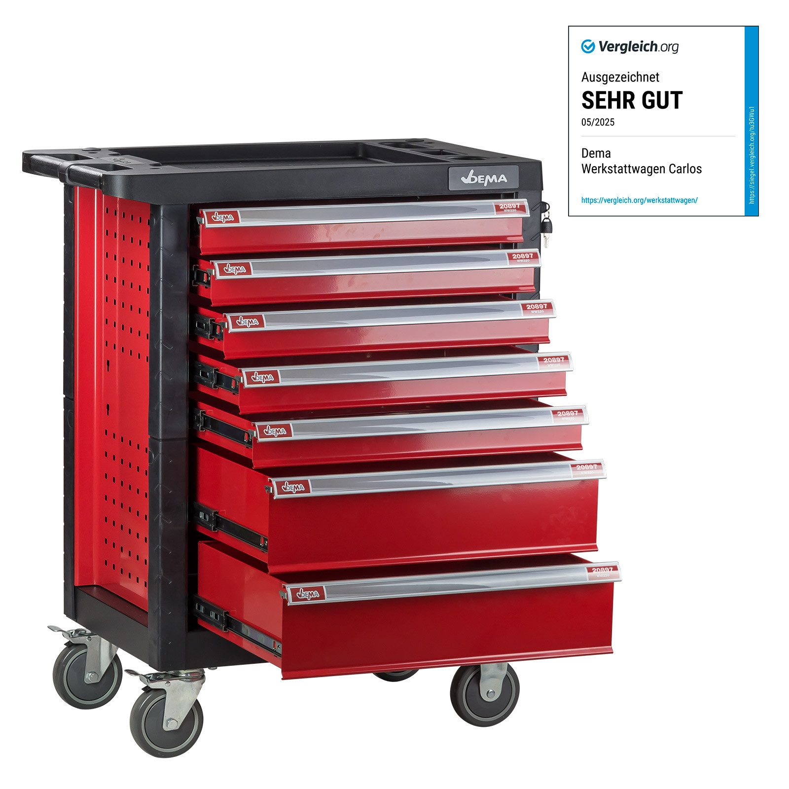Der Carlos Werkstattwagen kommt vollständig vormontiert, mit Ausnahme der Räder, was eine schnelle und unkomplizierte Einsatzbereitschaft gewährleistet. Zusätzlich sind Griffleisten mit Beschriftungsfeldern vorhanden, um einen raschen Überblick über den Inhalt jeder einzelnen Schublade zu ermöglichen. An den Seiten des Wagens befinden sich Lochbleche, die zusätzlichen Raum für Werkzeuge und Materialien bieten und optional mit unseren Hakensets verwendet werden können. Der Dema Werkstattwagen Carlos stellt sicher, dass Sie sämtliche benötigten Utensilien für Ihre Aufgaben stets griffbereit und sicher verwahrt haben.