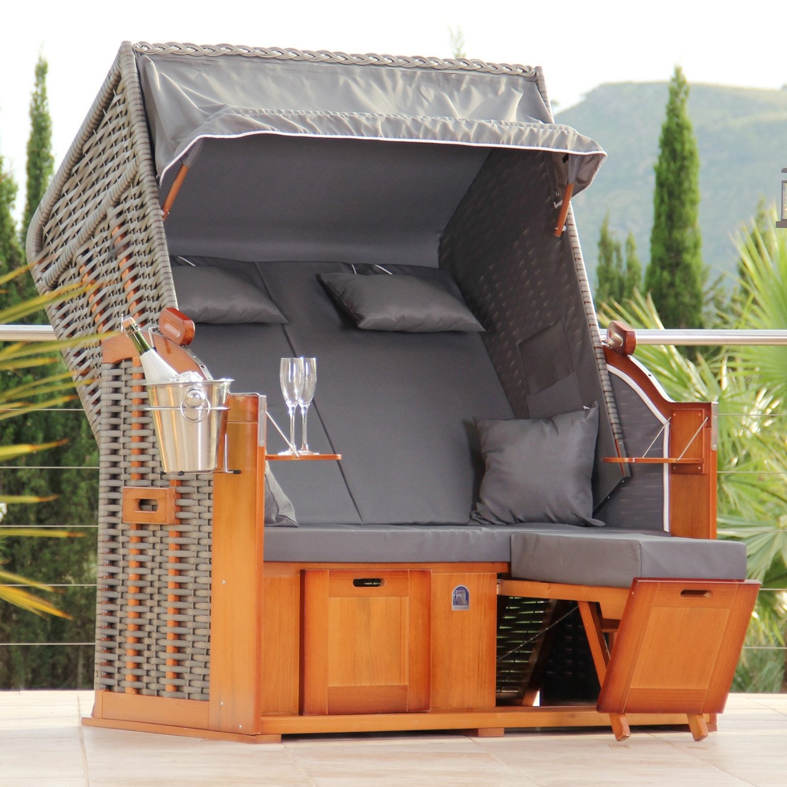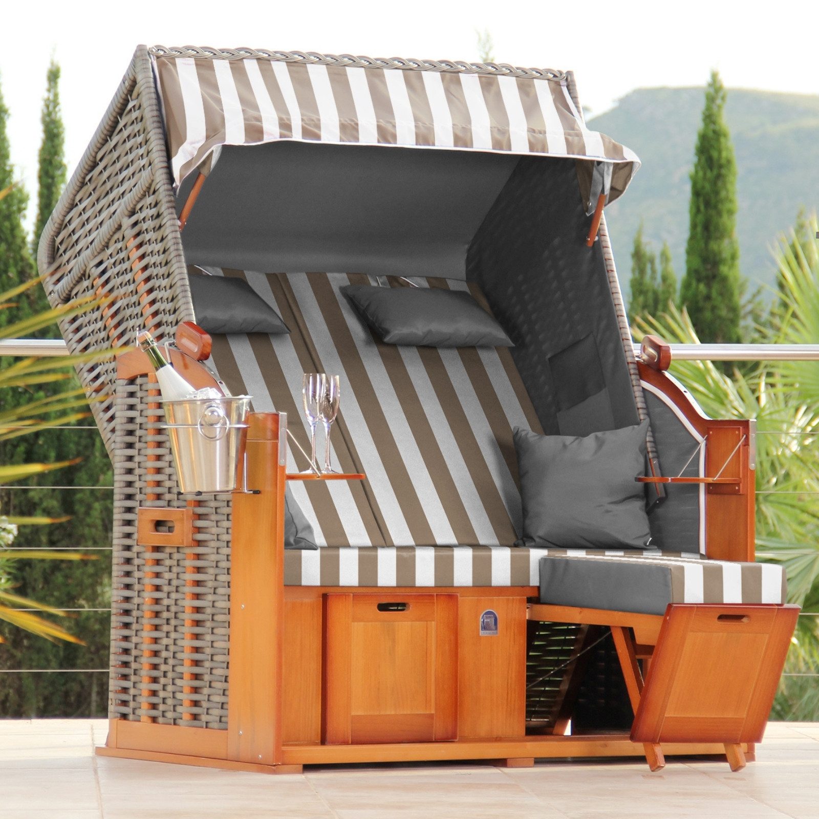 Mit einem Neigungswinkel von bis zu 170° bietet der Strandkorb flexible Nutzungsmöglichkeiten. Die extra dick gepolsterte Sitzfläche und die ebenfalls dick gepolsterten Fußkissen laden zum entspannten Verweilen ein. Zwei schwenkbare Klapptische und verstellbare Fußstützen erhöhen den Komfort zusätzlich.