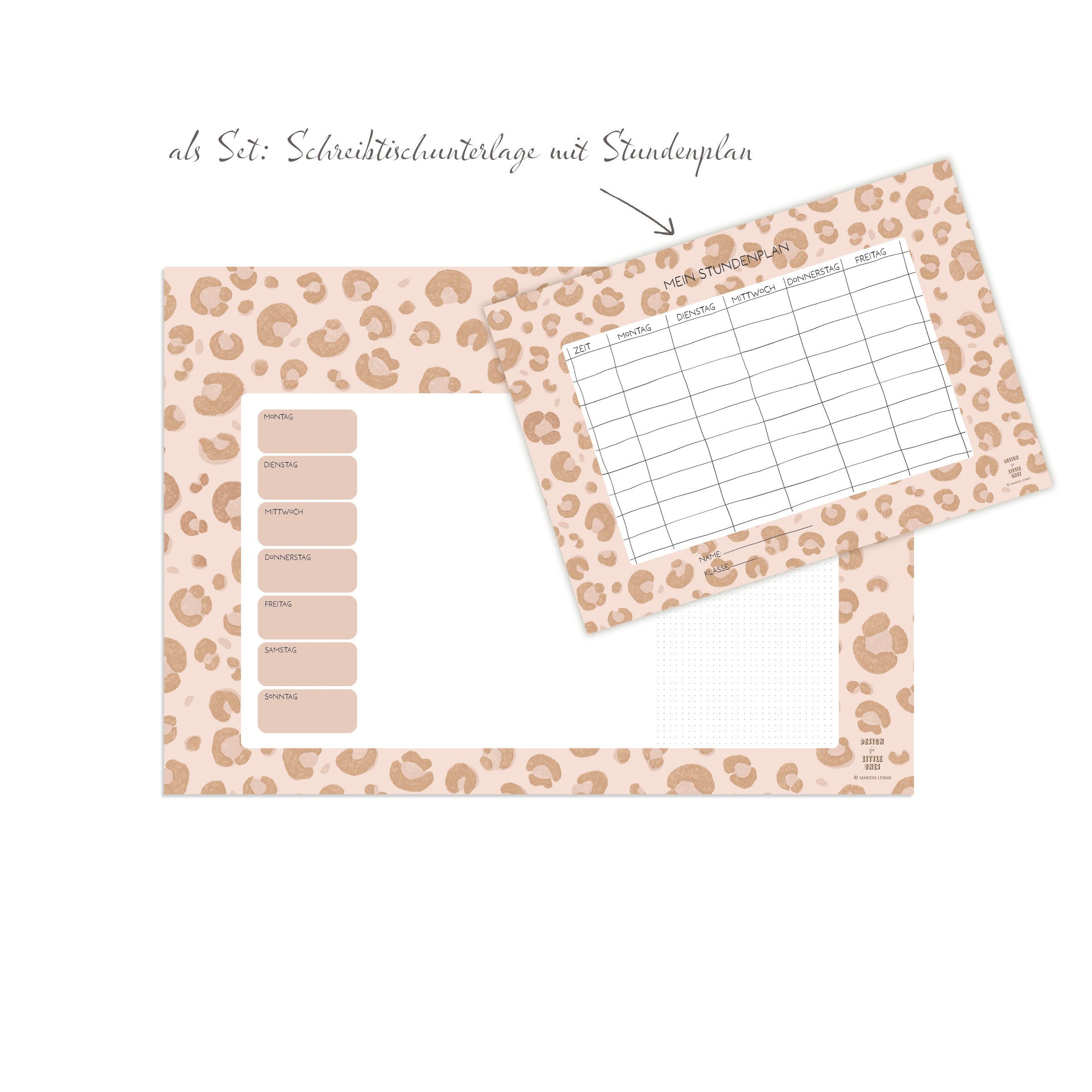Perfekt für den Schulstart! Diese schöne, pastellfarbene Schreibtischunterlage mit handgezeichneten Leo Muster, eignet sich nicht nur prima um die Woche zu organisieren, sondern auch um deinen Schreibtisch zu verschönern. Dazu passend den schönen Stundenplan für die Schule. Perfekt für Kinder jeden Alters - ein schönes geschmackvolles Geschenk. Die freie Fläche kann zum notieren, was nicht vergessen werden darf oder malen eigener, großartiger Kunstwerke genützt werden. Sehr schöne Druck- und Papierqualität. Diese liebevoll gestalteten Produkte helfen deinem Kind den Überblick beim Tagesablauf zu behalten. In der Schulzeit mit Hilfe des übersichtlichen Stundenplans und in der Freizeit mit der Schreibtischunterlage um alles andere festzuhalten und zu verstehen. Eine schöne Geschenkidee die ein lebendiges Ambiente im Kinderzimmer schafft, das sowohl praktisch, lernorientiert und dekorativ ist. · Unterlage: 35 x 50cm groß, 25 Blatt Papier 90g · Stundenplan: Din A4 190g · Hochwertig bedruckt, Premiumpapier, sehr gut zum beschreiben · Hergestellt in Deutschland