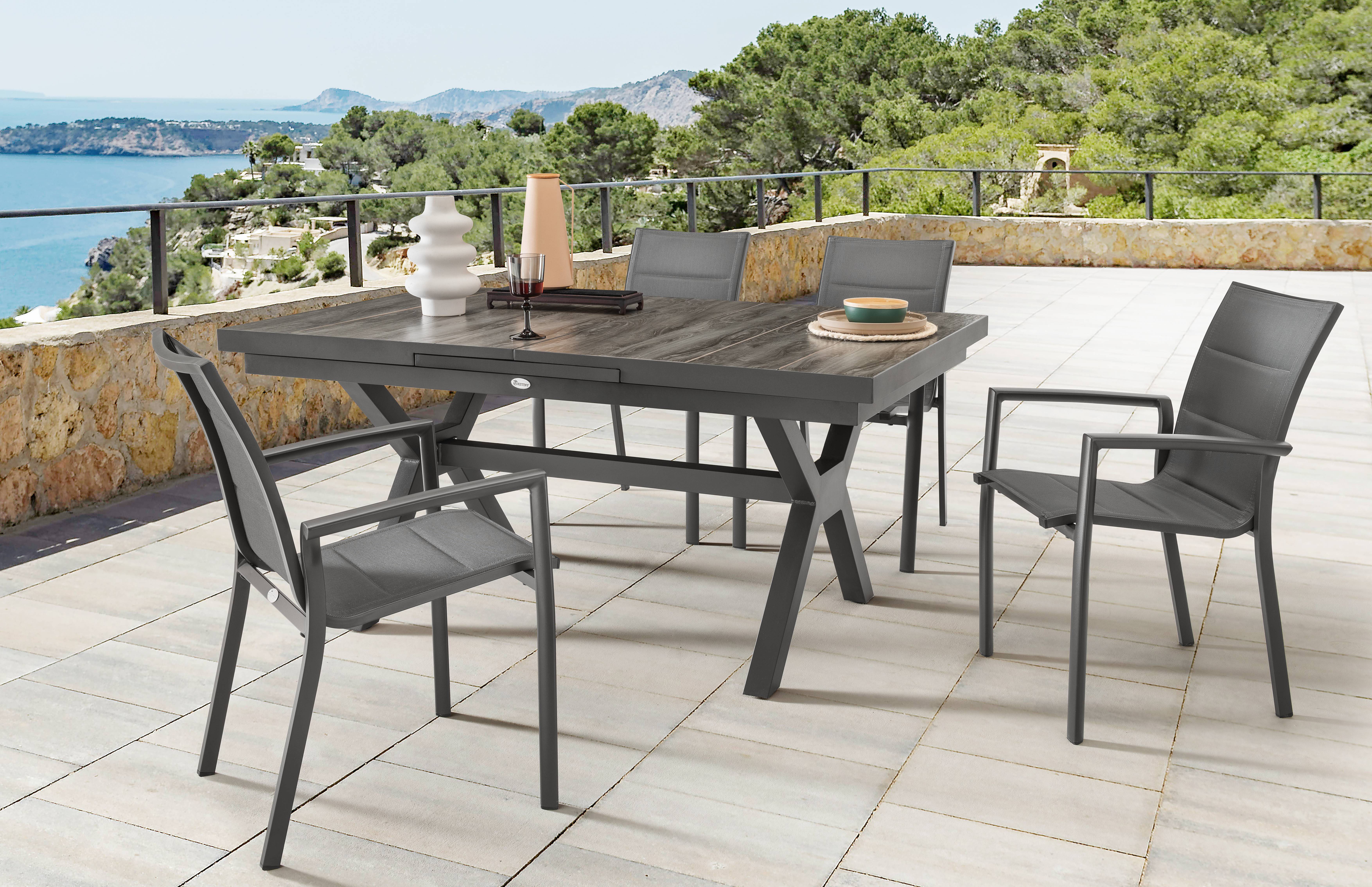 Set beinhaltet | 1 Ausziehtisch, 4 Stapelsessel |